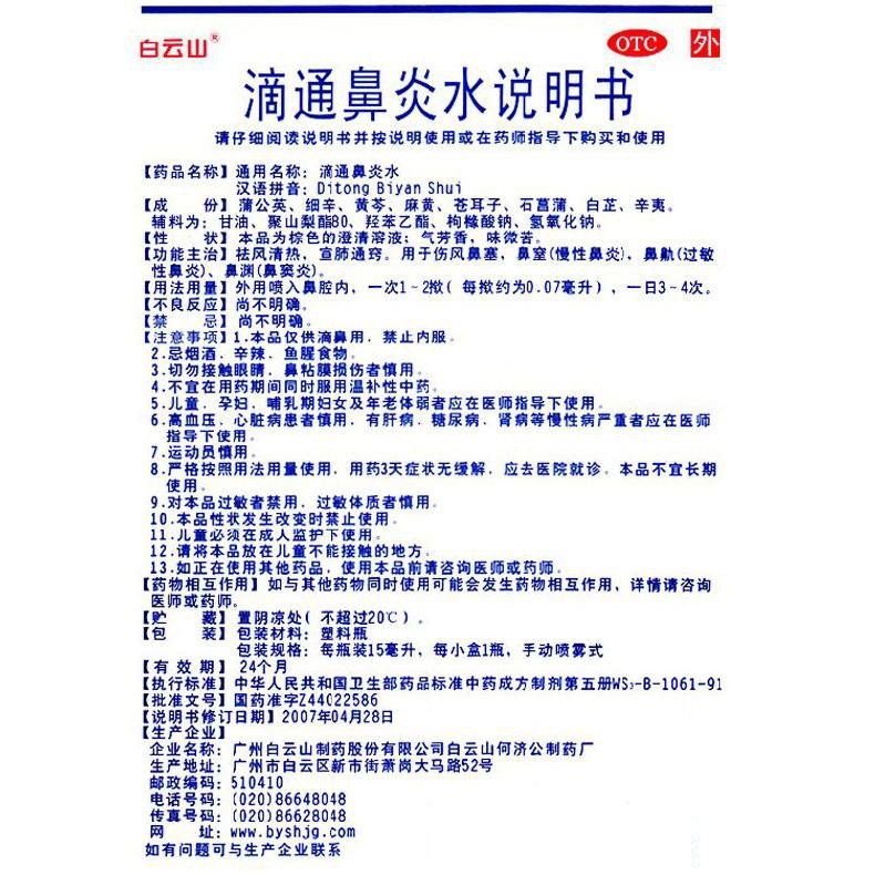 📚 白云山 滴通鼻炎水15ml 鼻炎药过敏性鼻炎鼻窦炎喷雾过敏药滴鼻液
