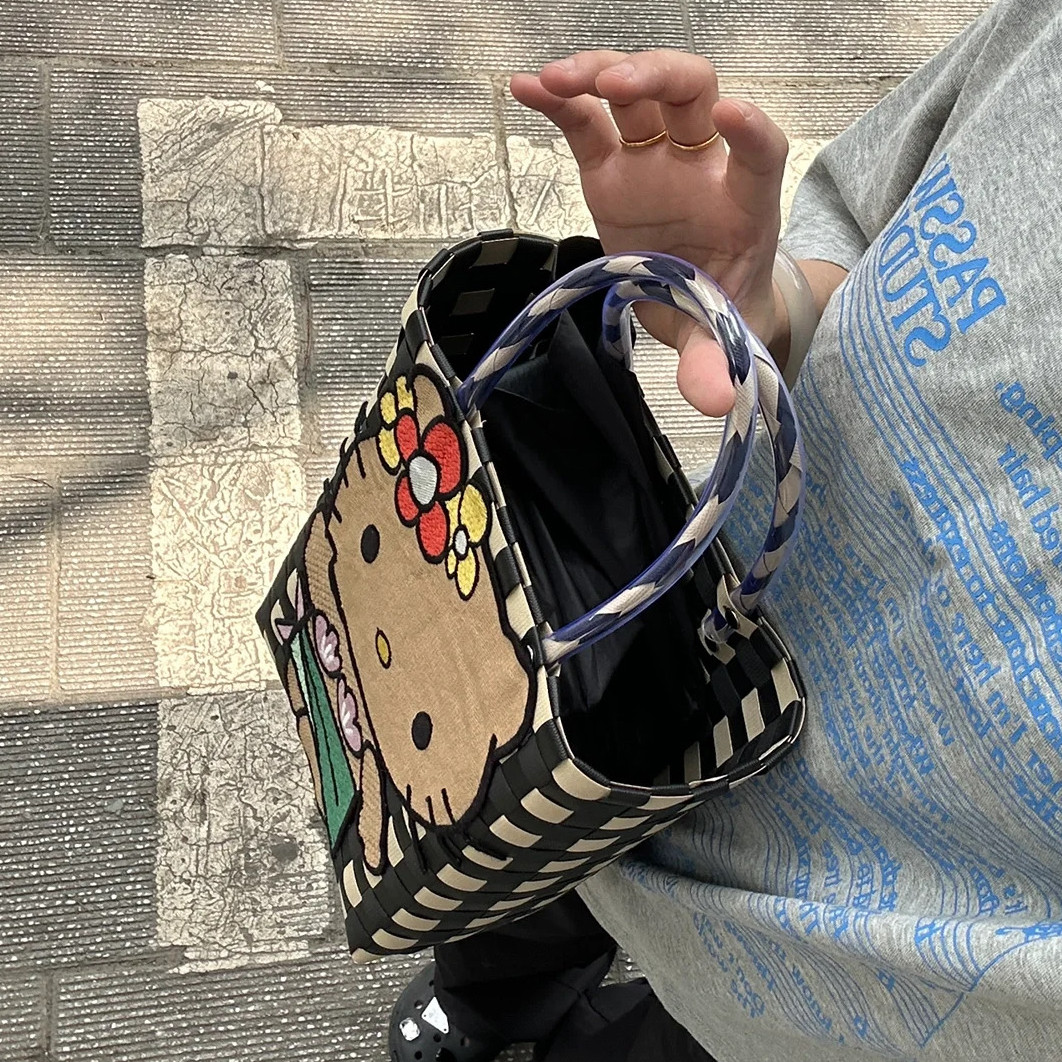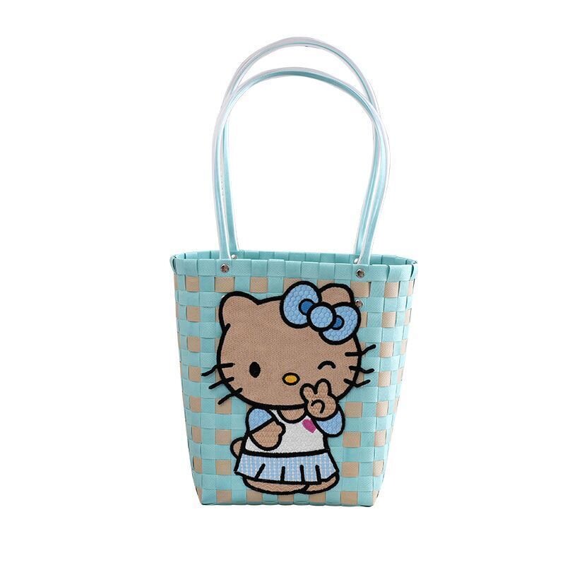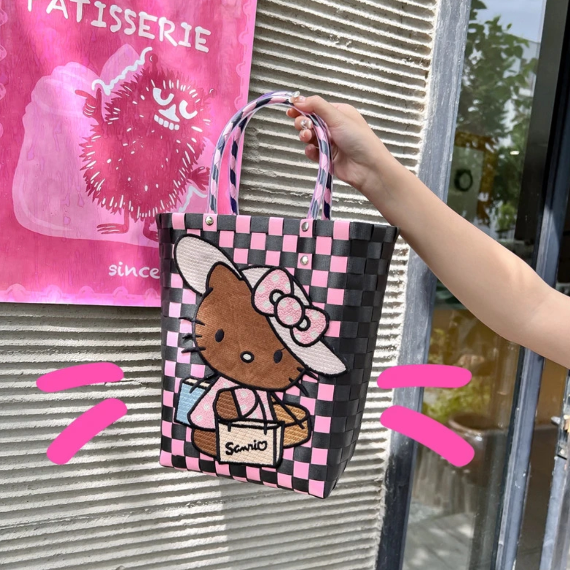 📚 HelloKitty编织菜篮子包包女大容量kt猫沙滩手提包可爱黑皮Kitty