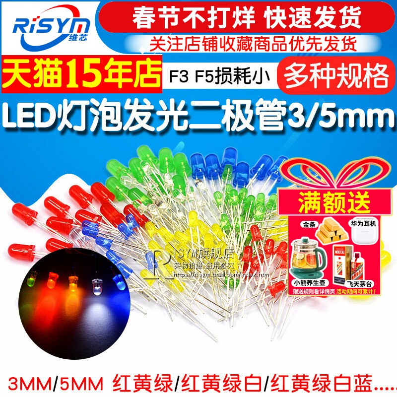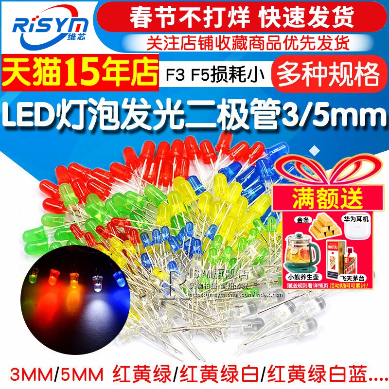 📚 3mm 5mmLED小灯泡发光二极管F3F5红绿黄蓝白色直插灯珠元件包指示