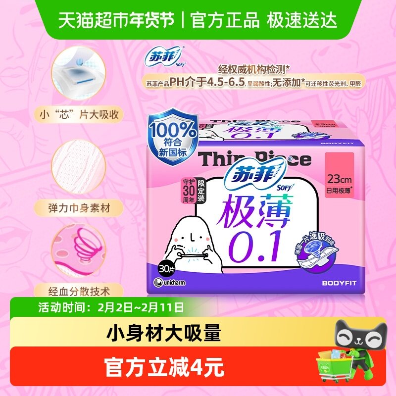 📚 苏菲卫生巾弹力贴身极薄0.1洁翼型日用姨妈巾230mm