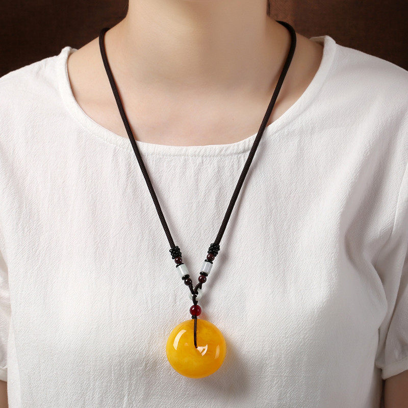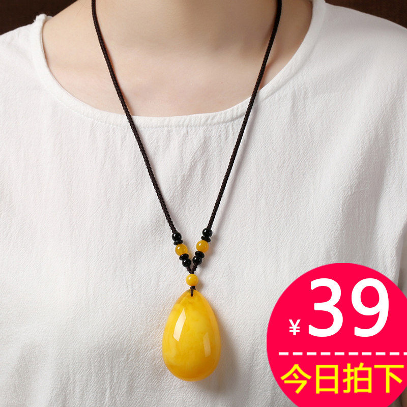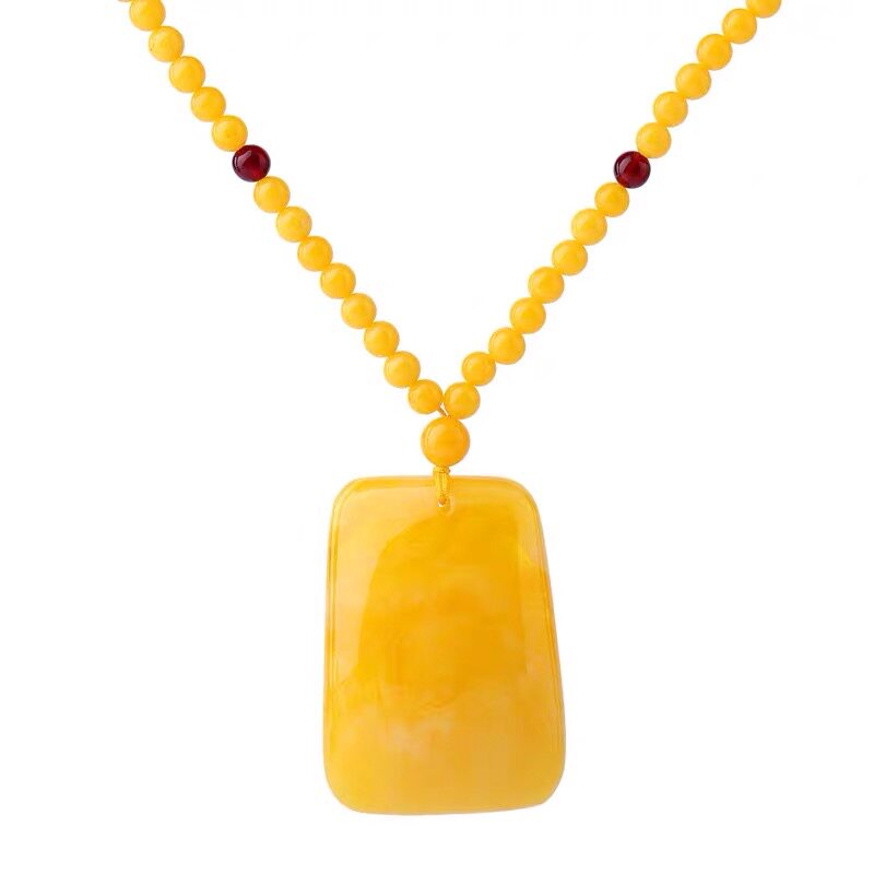 📚 鸡油黄蜜蜡水滴吊坠琥珀平安方牌项链长款男女民族风配饰毛衣链
