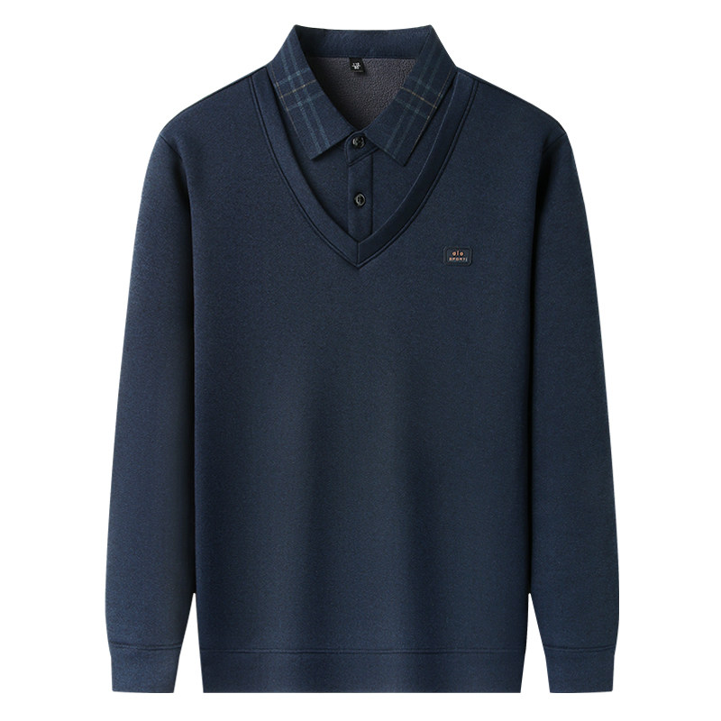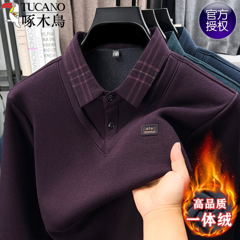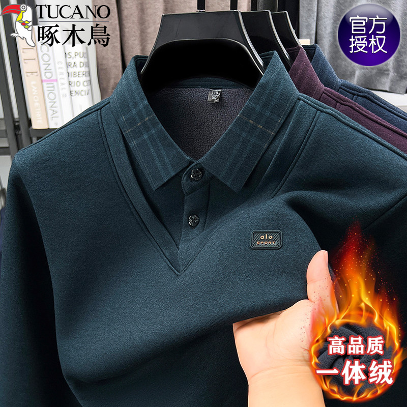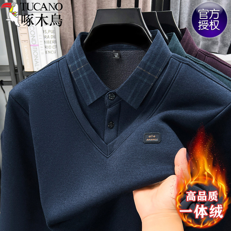 📚 啄木鸟假两件衬衫领毛衣男士加绒加厚保暖一体绒长袖秋冬款爸爸装