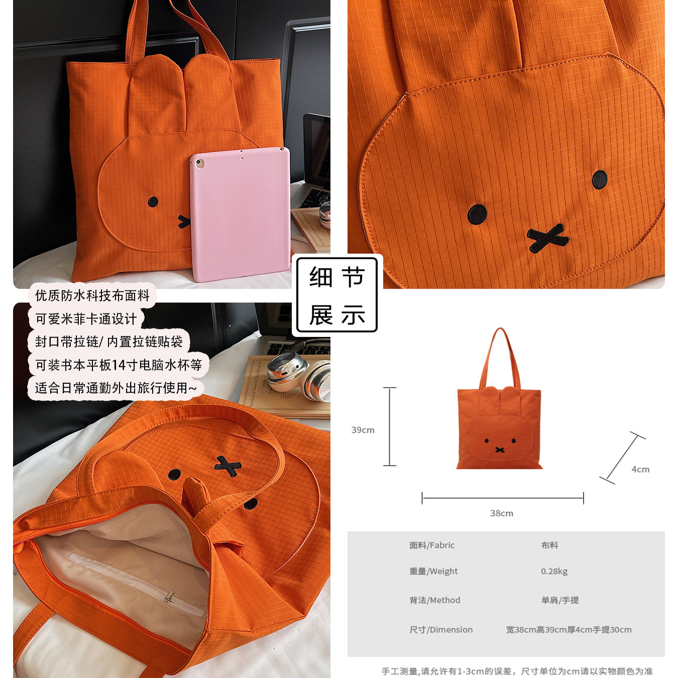 📚 通勤包包女可爱米菲兔托特包新款防水科技布大容量包带拉链单肩包