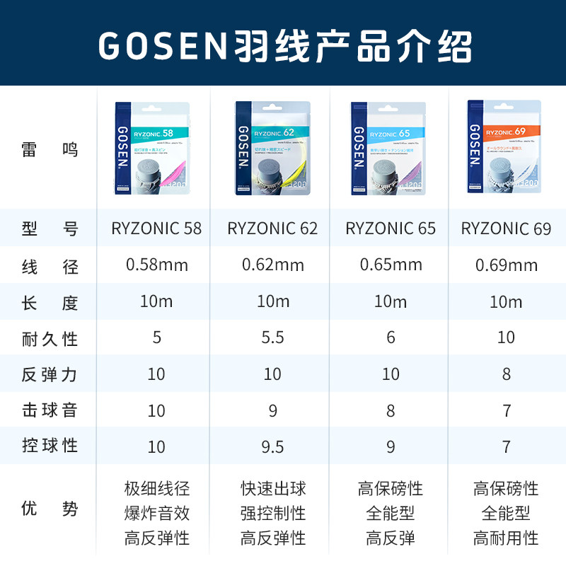 📚 正品GOSEN高神RYZONIC58 62 65 69雷鸣羽毛球线 高弹 超强击球音