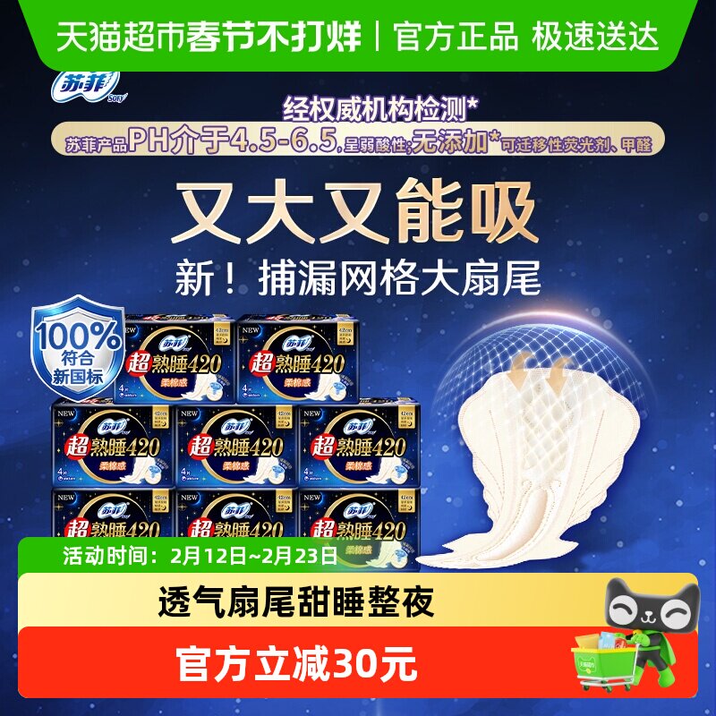 📚 苏菲卫生巾超熟睡柔棉感防侧漏护翼量多夜用姨妈巾420mm