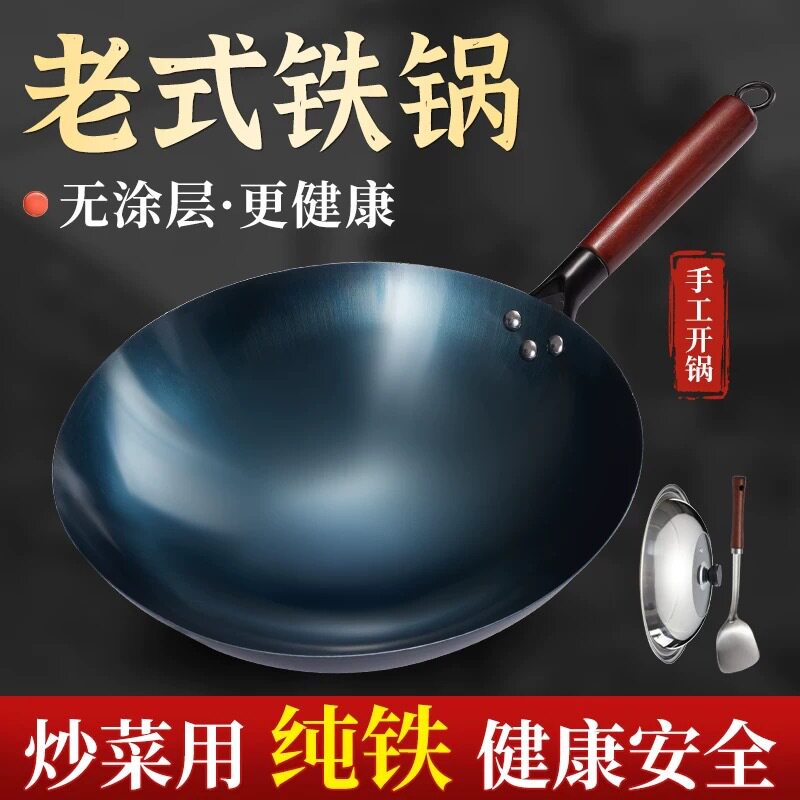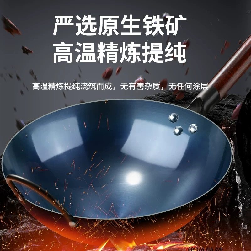 📚 传统铁锅摆摊炒菜爆炒不粘锅烤蓝开锅圆底无涂层燃气灶煤气炉通用