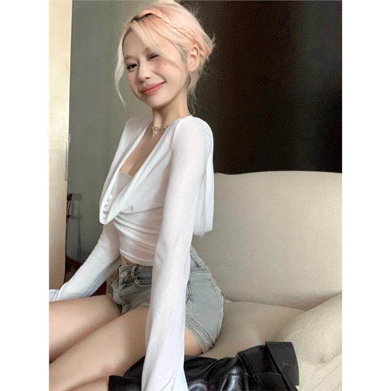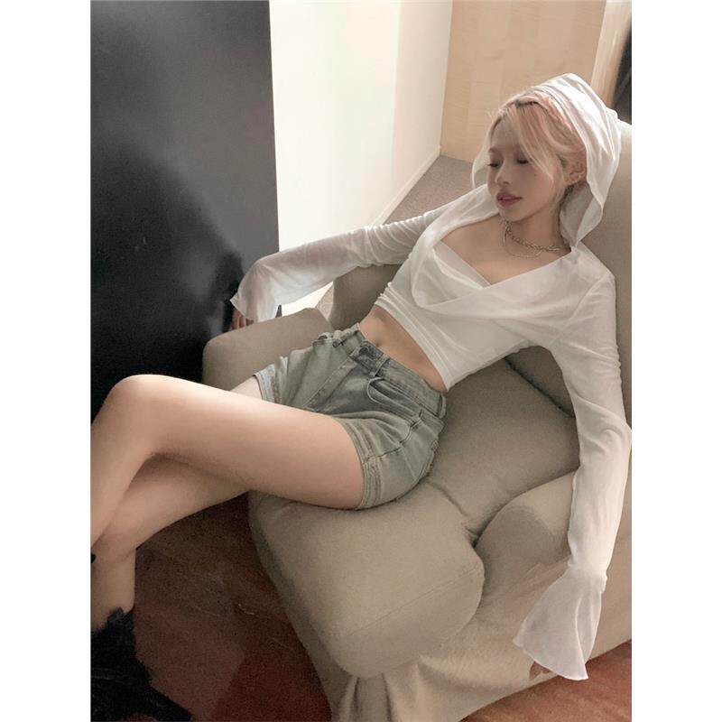 📚 辣妹跳jazz爵士舞上衣白色长袖露脐短款连帽t恤女团风练功演出服