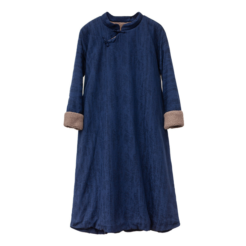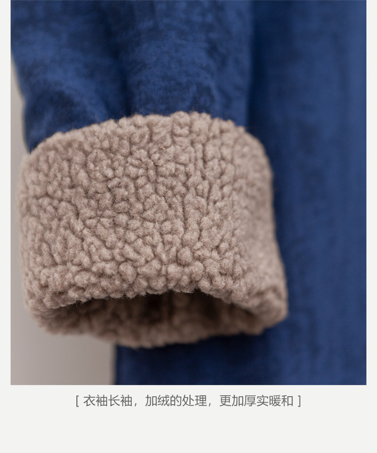 📚 冬复古中式藏蓝色棉麻保暖羊羔绒宽松棉袍子 斜襟立领民族风棉袄