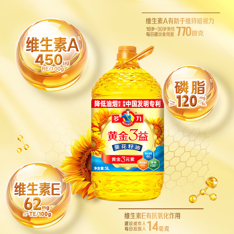📚 多力黄金3益葵花籽油5L升级食用油 充氮保鲜好油清亮精炼进口原料