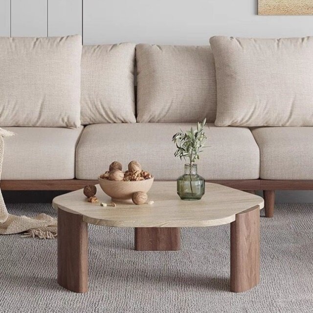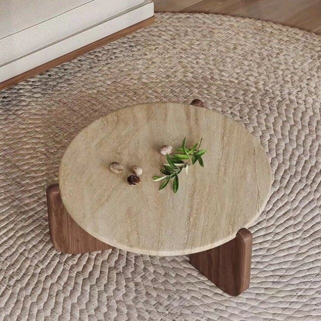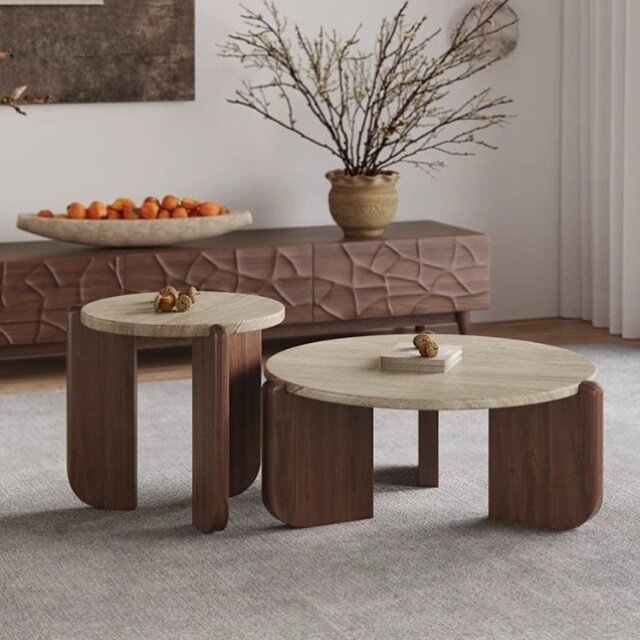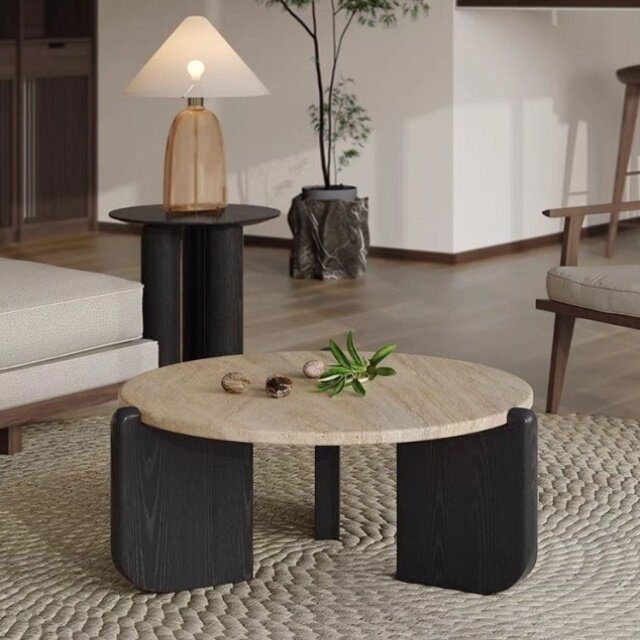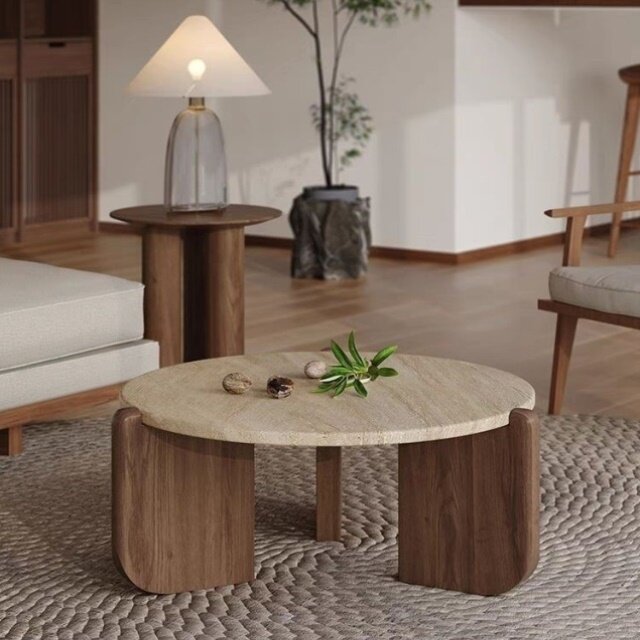 📚 侘寂风实木洞石茶几极简小茶台小户型客厅家用圆形阳台大理石矮桌