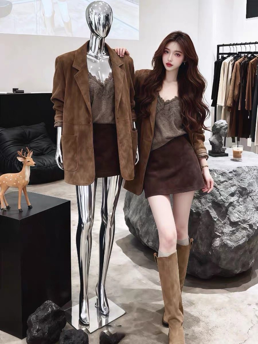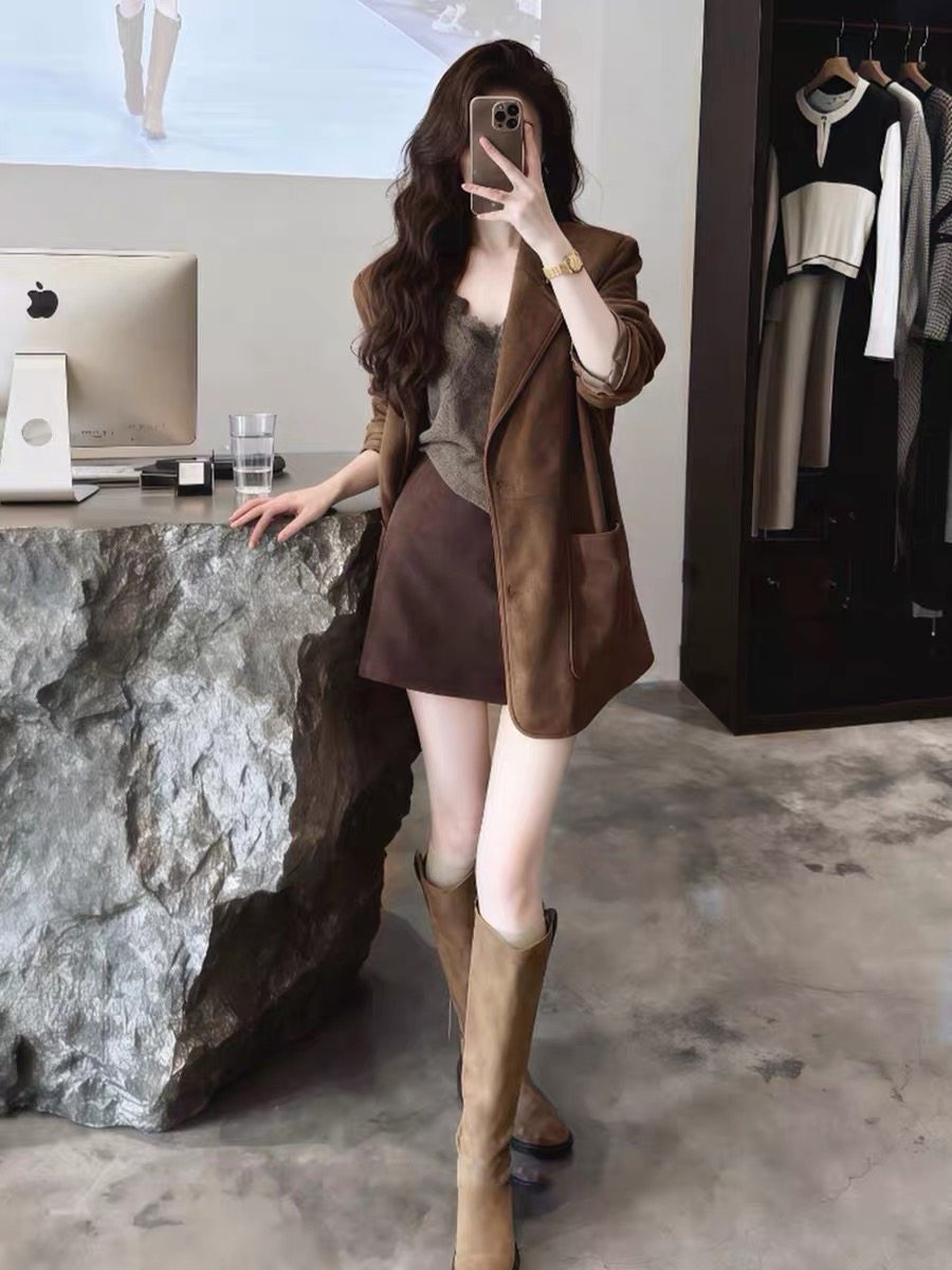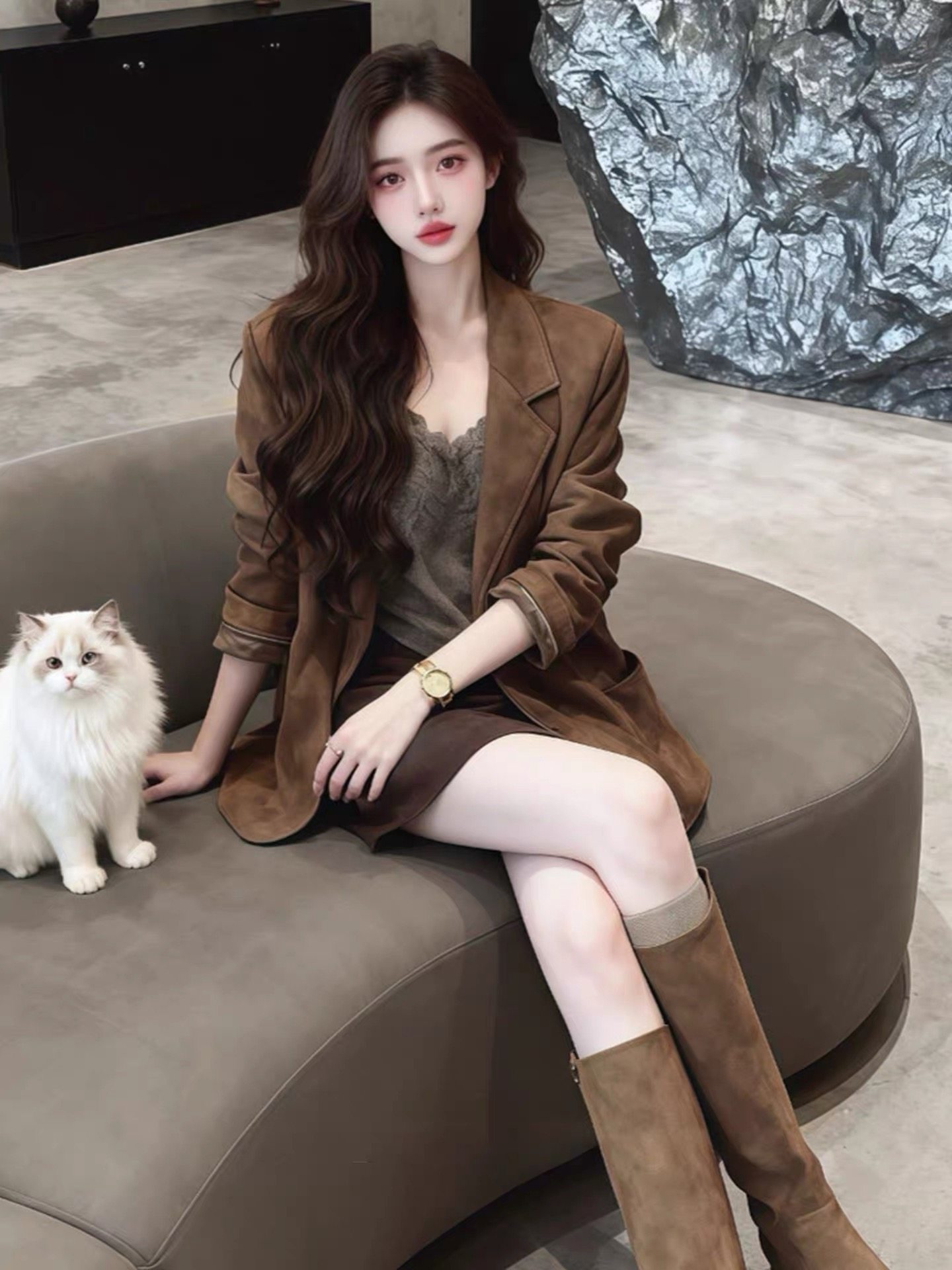 💥麂皮西装外套女2025秋冬新款美拉德色高级感御姐时尚西装短裙套装,券后价66!💖