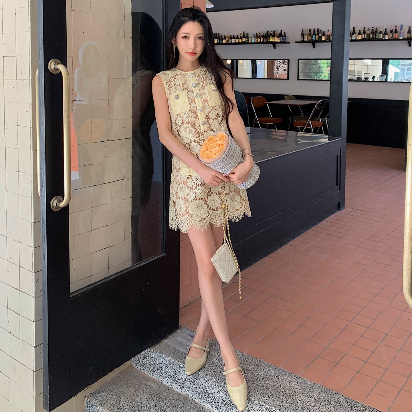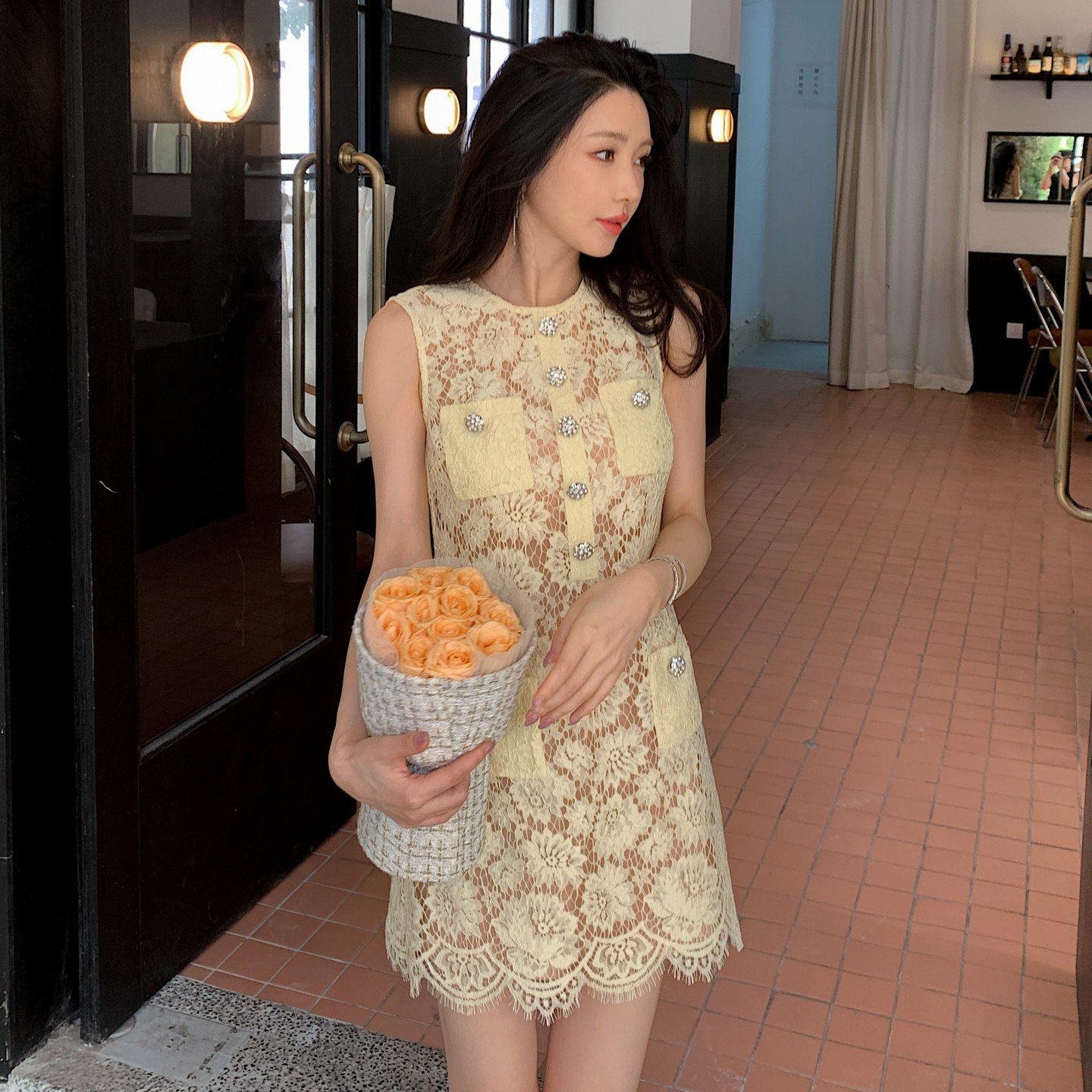 📚 秋季新款女装法式小香风蓝色蕾丝花朵无袖短款A字连衣裙新到黄色