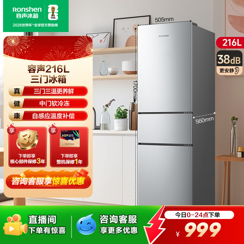 📚 容声216L三开门小型冰箱家用出租房宿舍冷藏冷冻节能以旧换新补贴