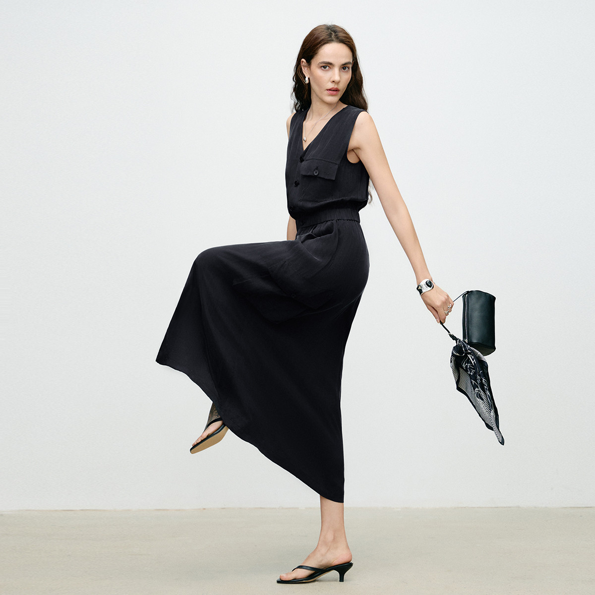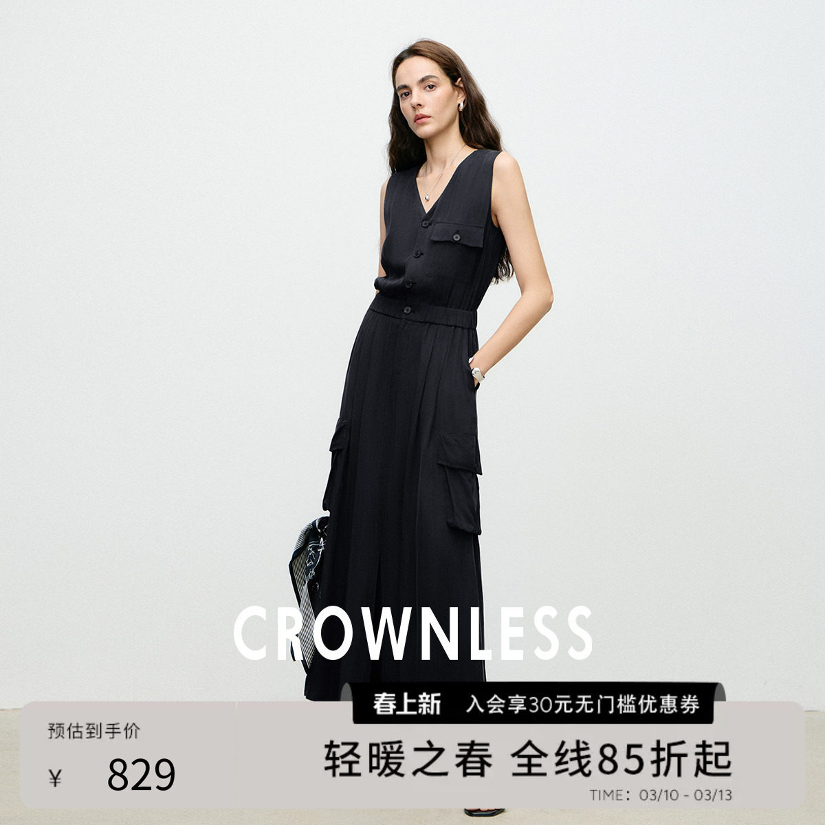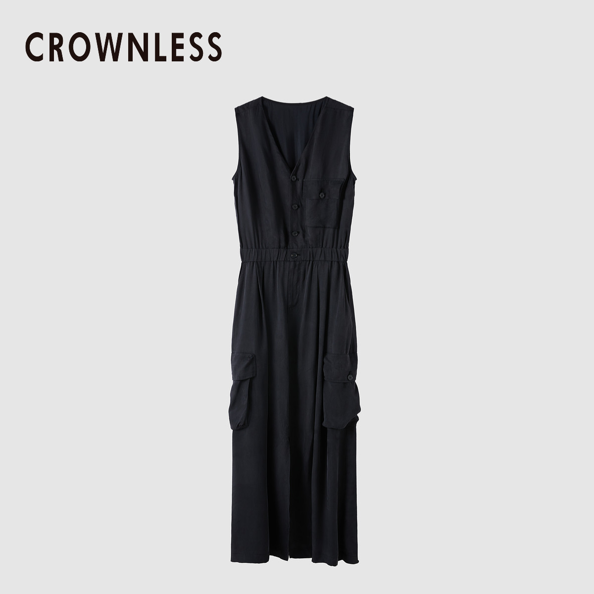 📚 CROWNLESS未冕凉感雾光铜氨VISCOSE25夏工装多口袋V领无袖连衣裙