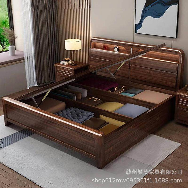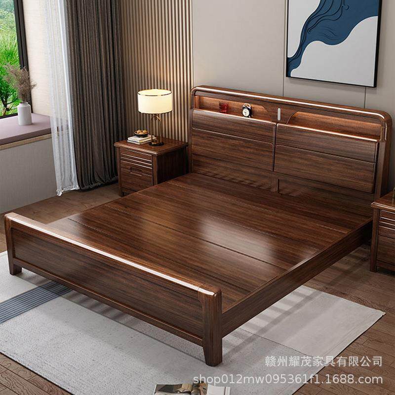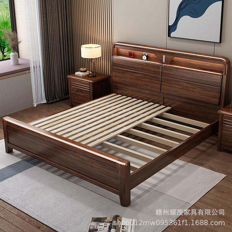 📚 实木床热销榜1米5胡桃木榫卯结构180x200带床垫感应灯储物双人床