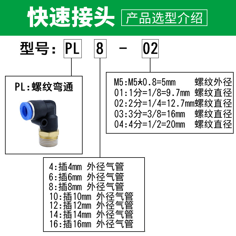 📚 气动快速接头PL8-02气管气缸快插螺纹弯通PL4/6/1012-M5-01-02-04
