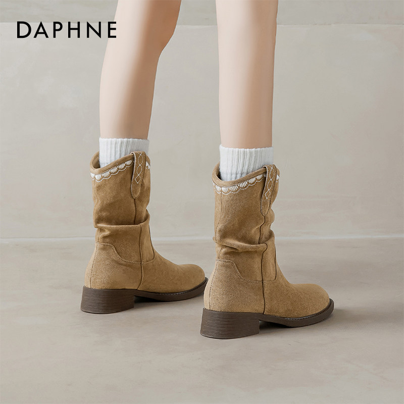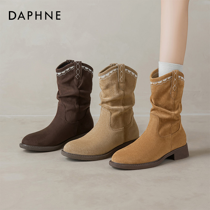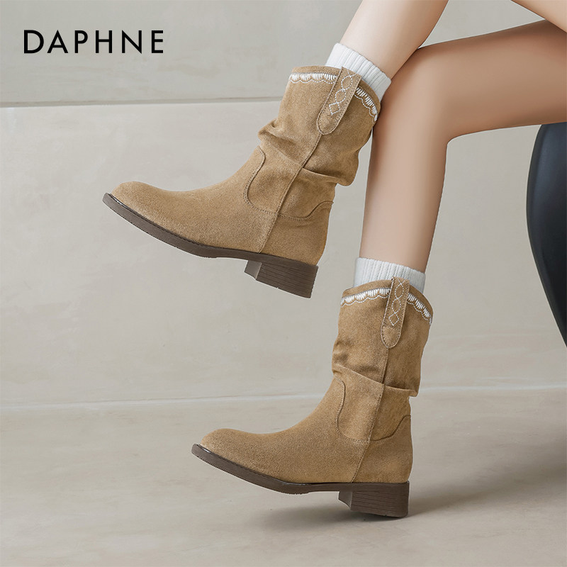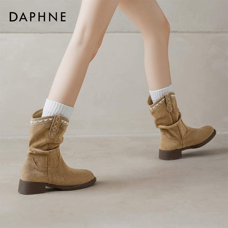 📚 达芙妮堆堆短靴女2026春夏新款美拉德厚底马丁靴西部牛仔棕色靴子