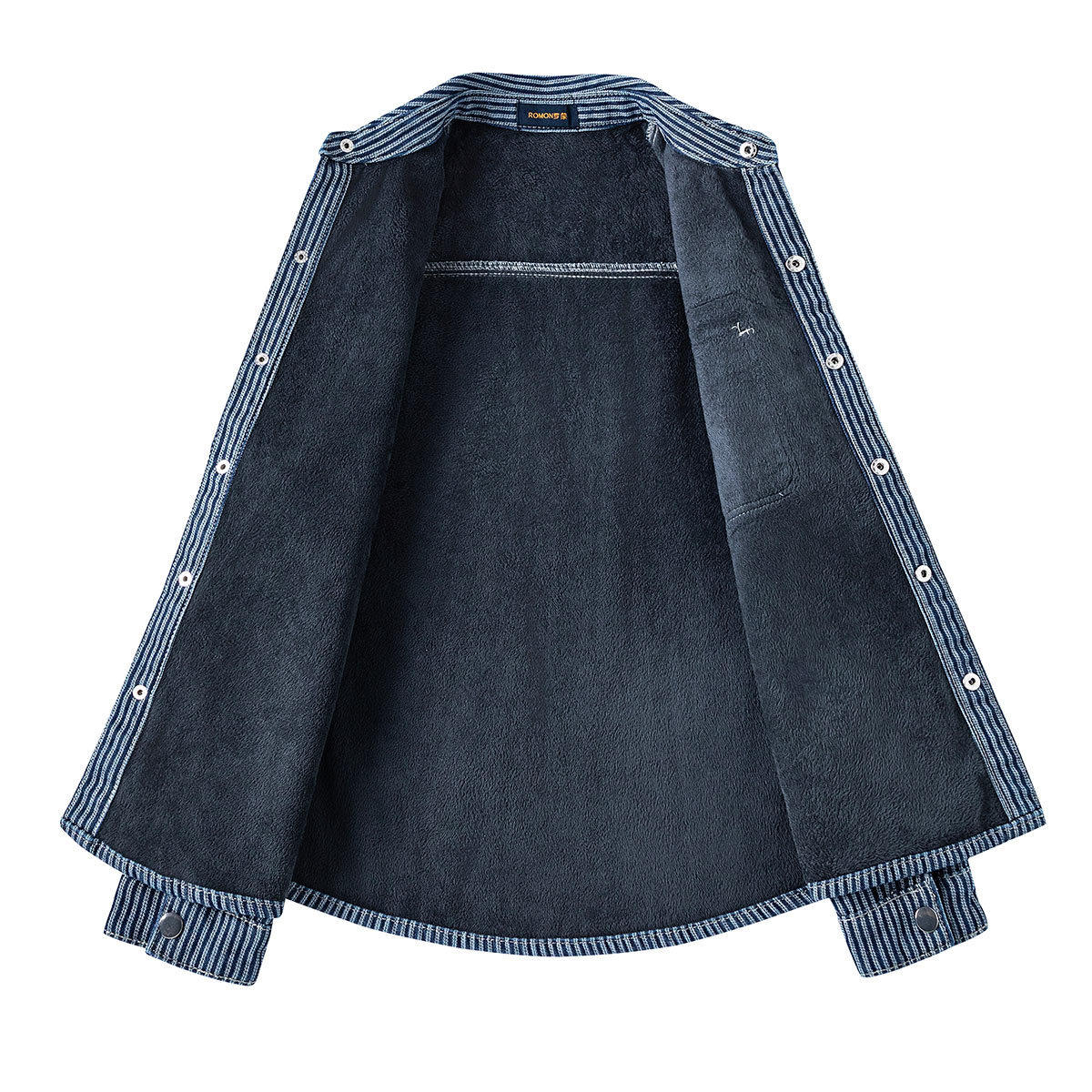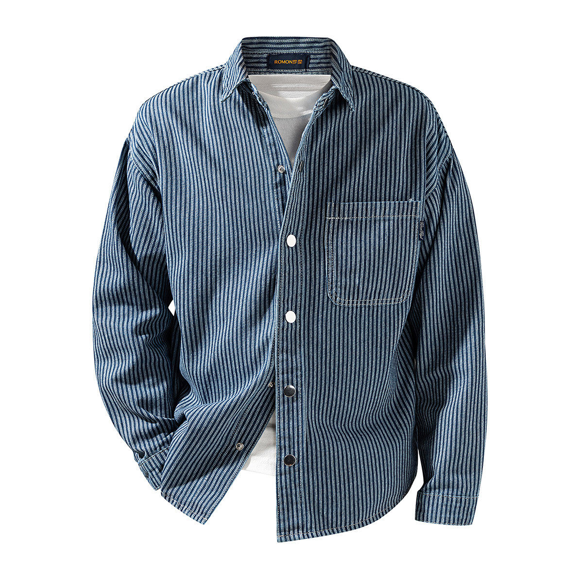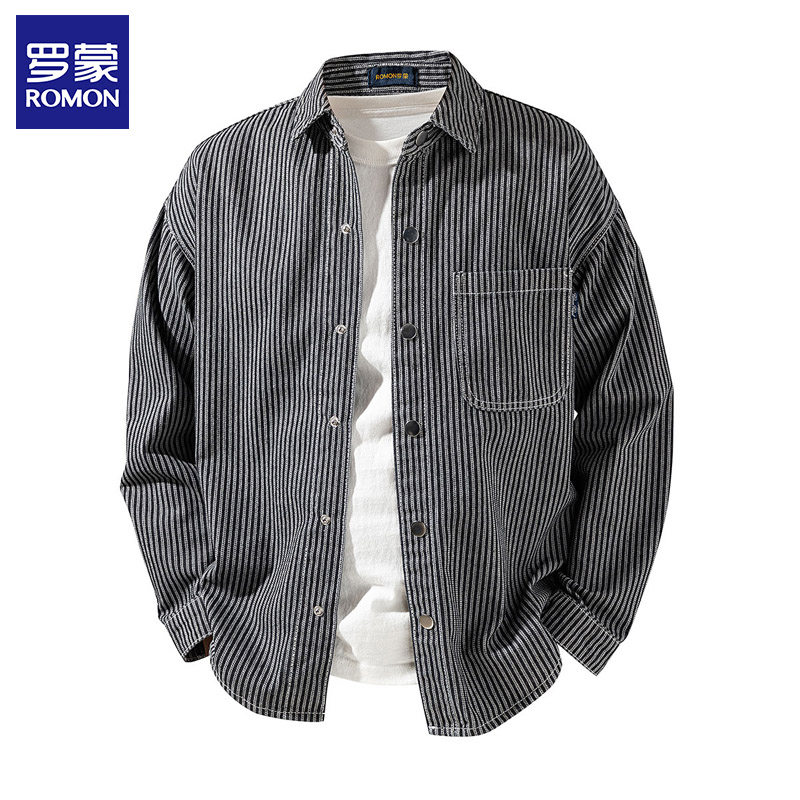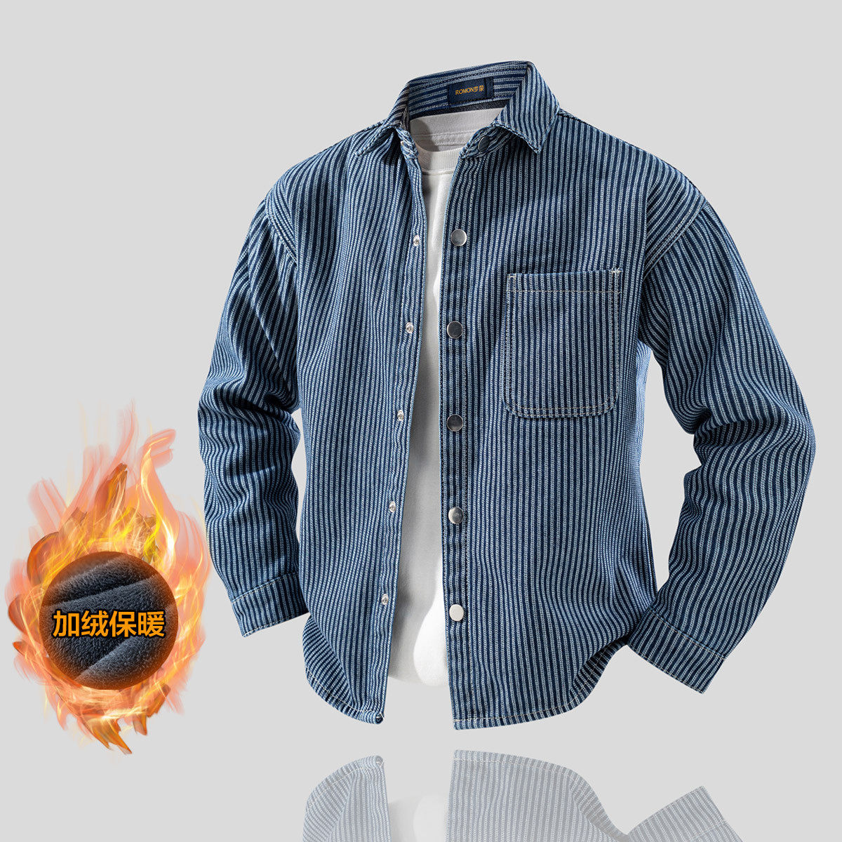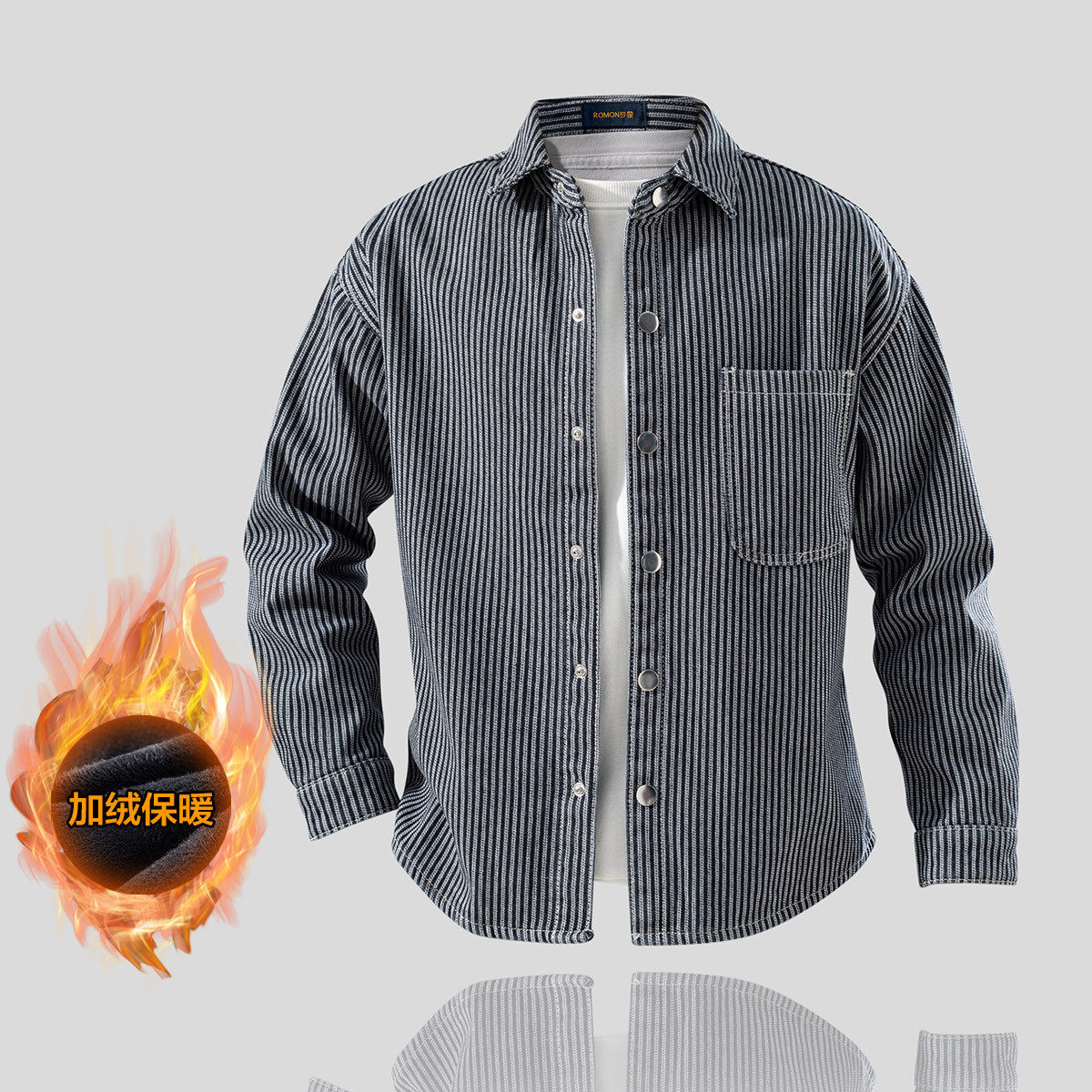 📚 罗蒙竖条纹牛仔长袖衬衫外套春秋冬加绒加厚男士口袋外穿翻领衬衣