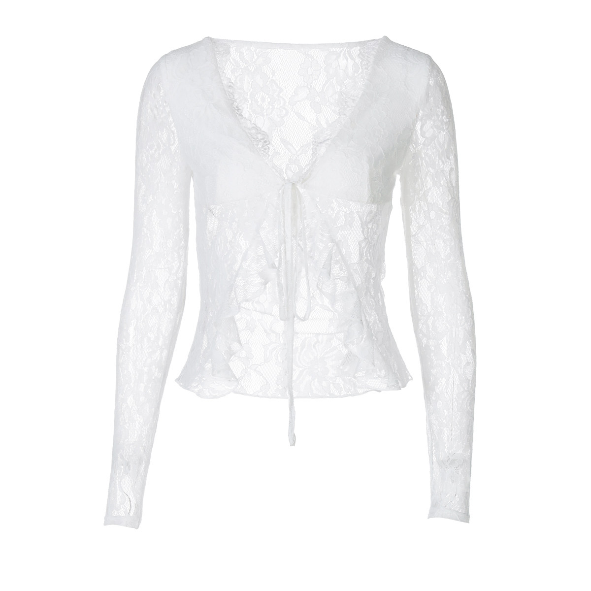 📚 法式纯欲高级感半透蕾丝V领开衫系带上衣辣妹百搭露腰外穿长袖T恤