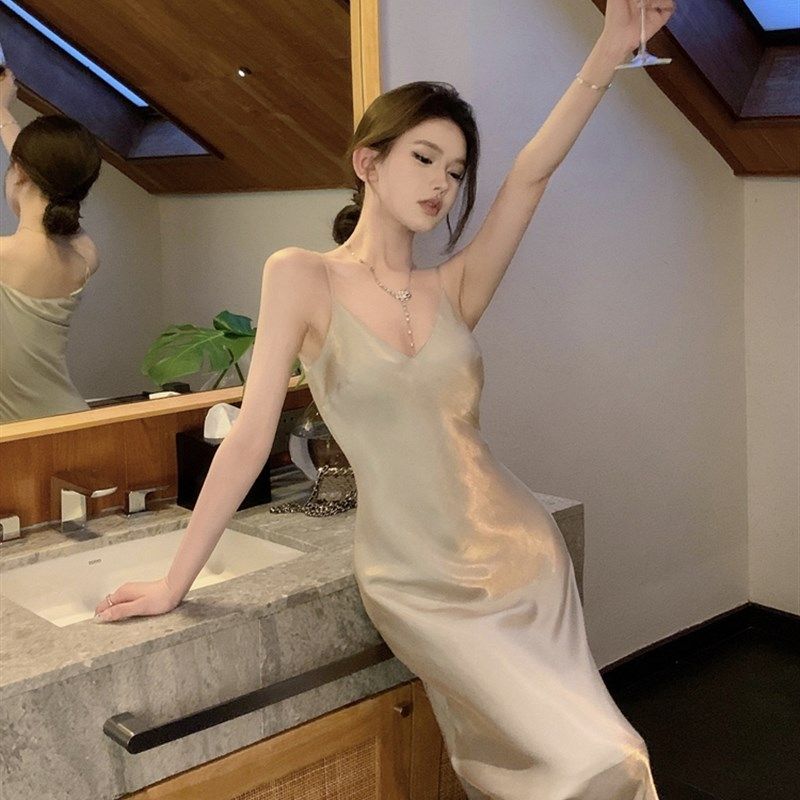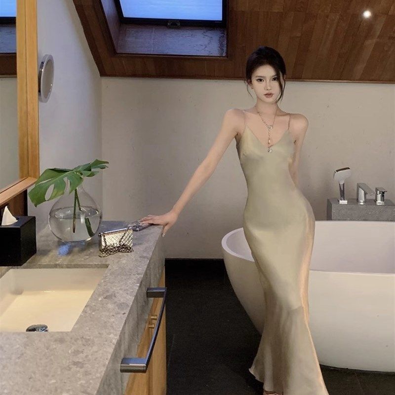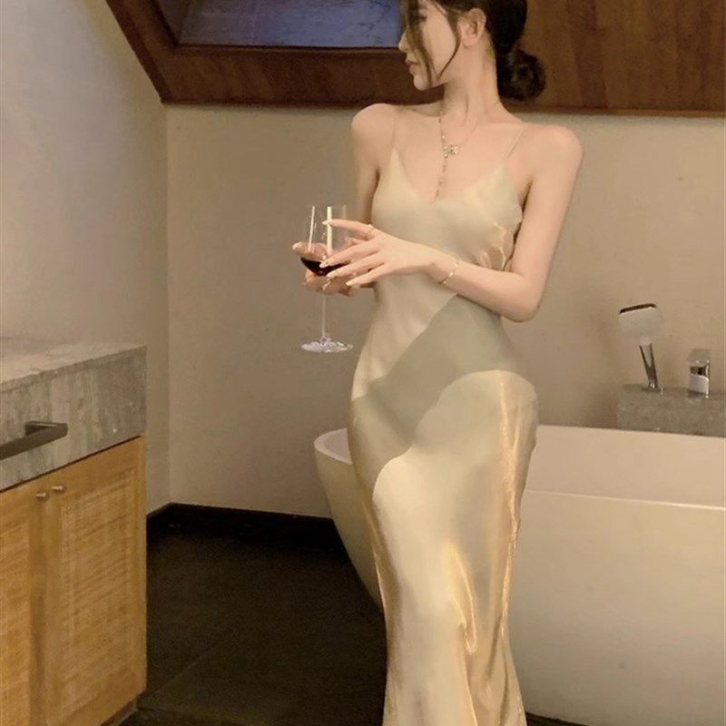 📚 高级感法式缎面v领吊带连衣裙女收腰小个子鱼尾中长裙宴会礼服裙