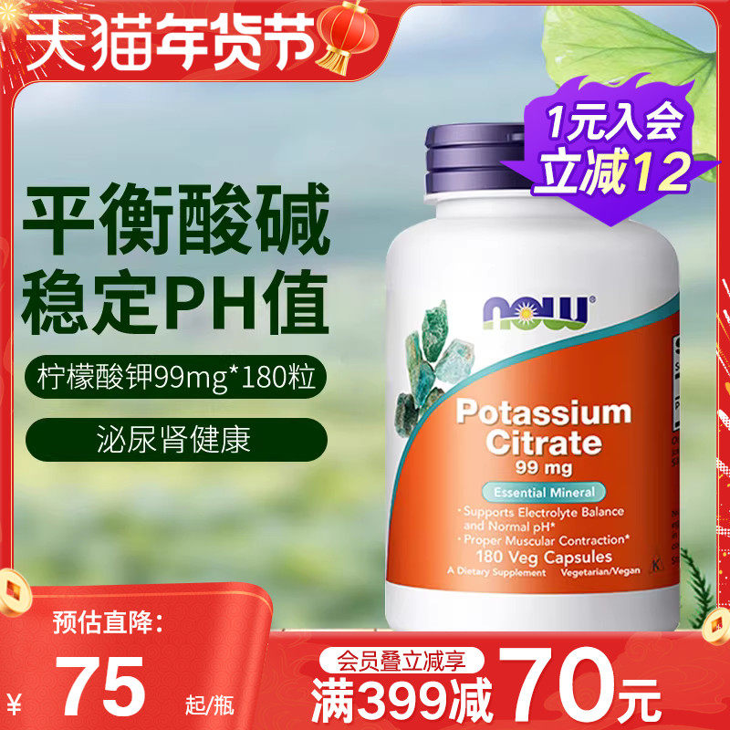 📚 NOW美国进口柠檬酸钾胶囊平衡酸碱PH值99mg高含量180粒消浮肿补钾