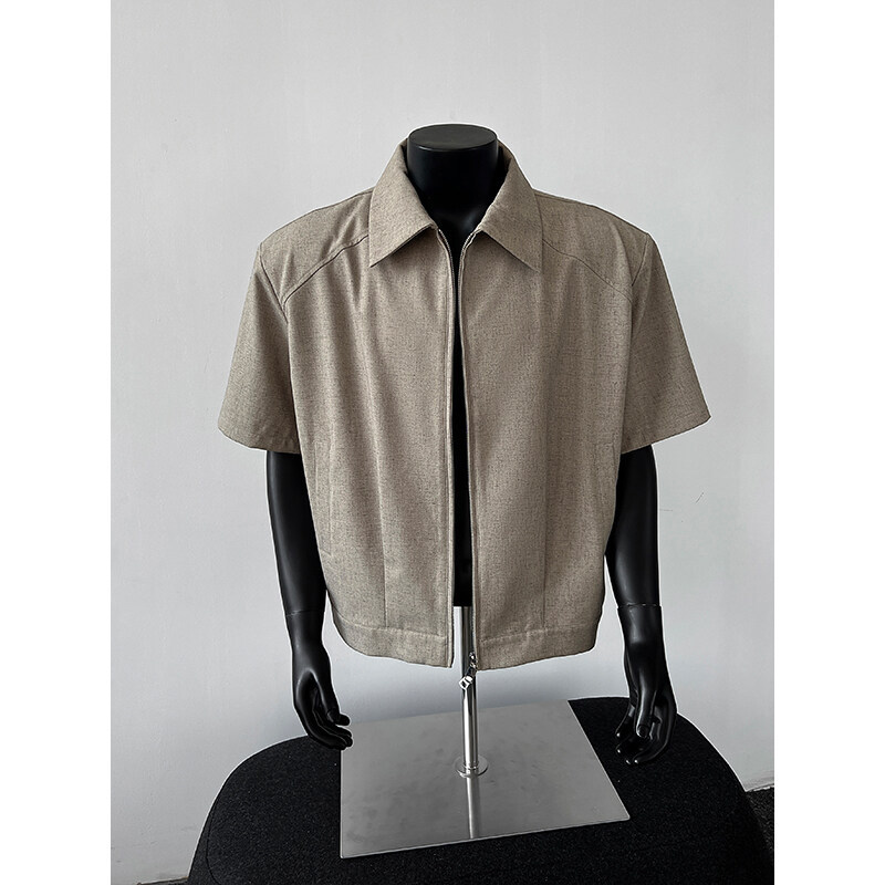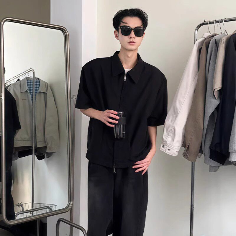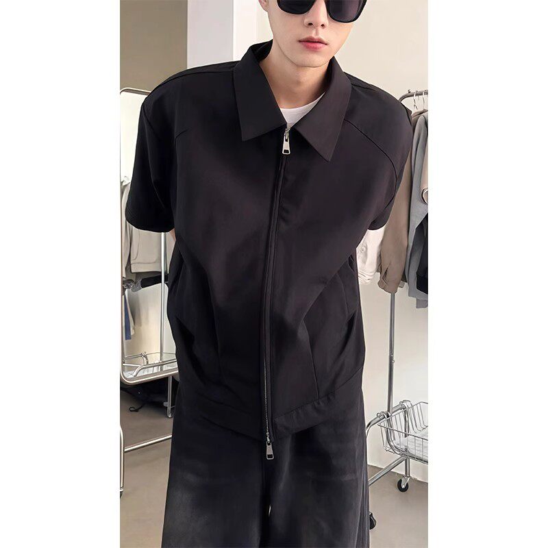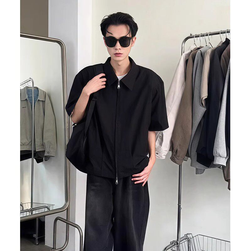 📚 cleanfit垫肩短袖外套男款夏季潮牌痞帅高级感黑色短款衬衫式夹克