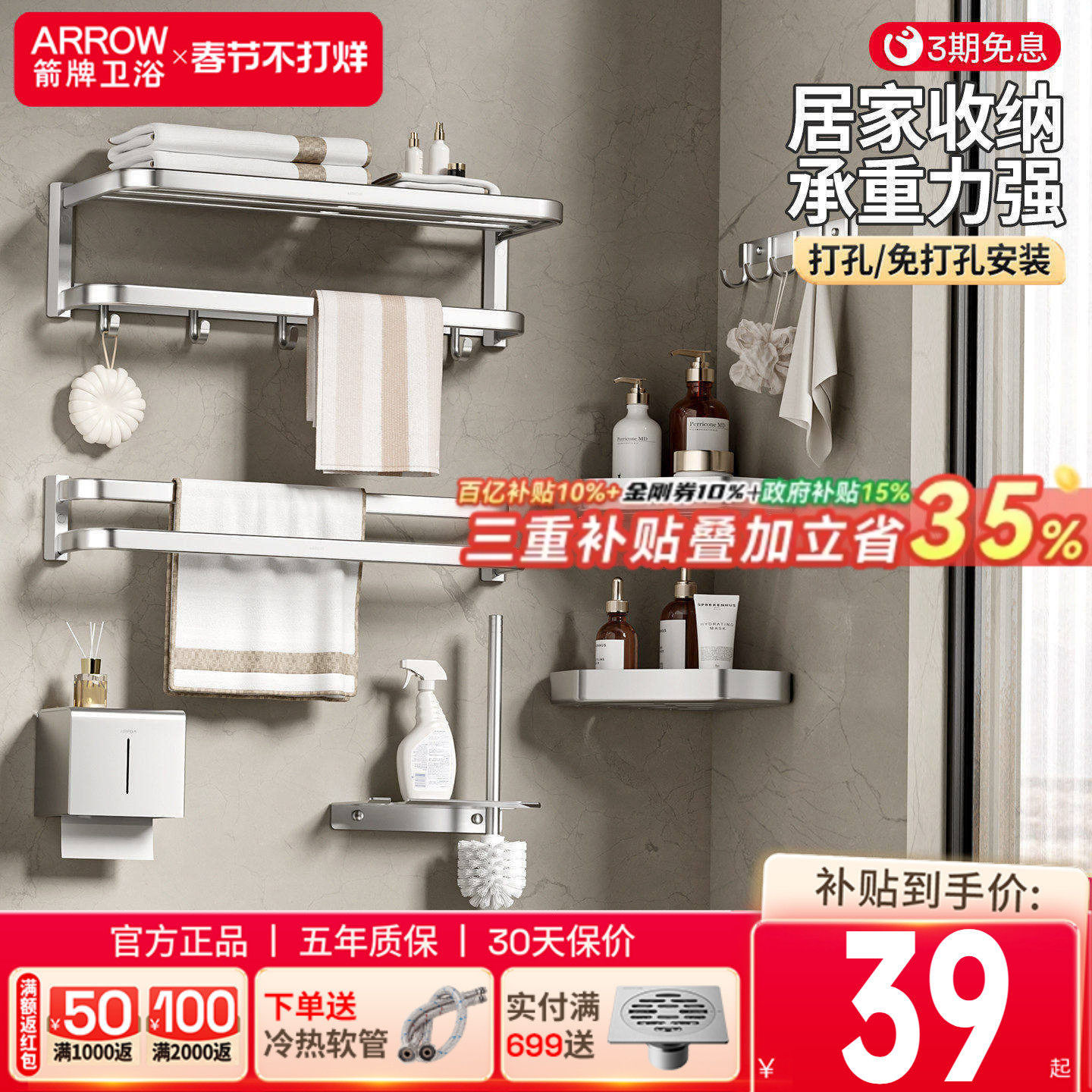 📚 箭牌毛巾架免打孔太空铝五金挂件套装卫生间折叠浴巾架浴室置物架