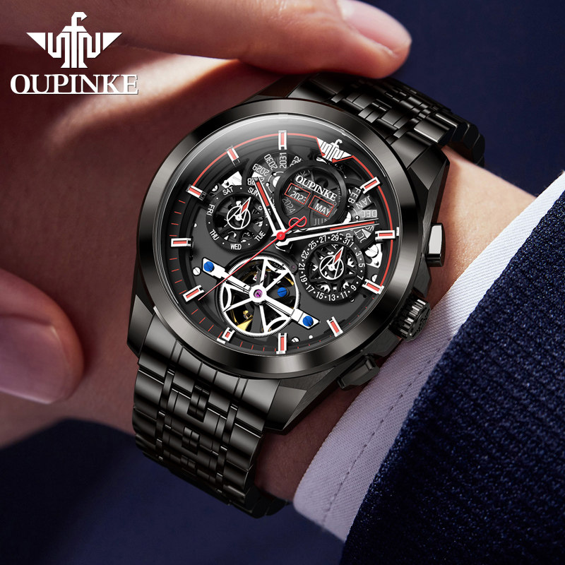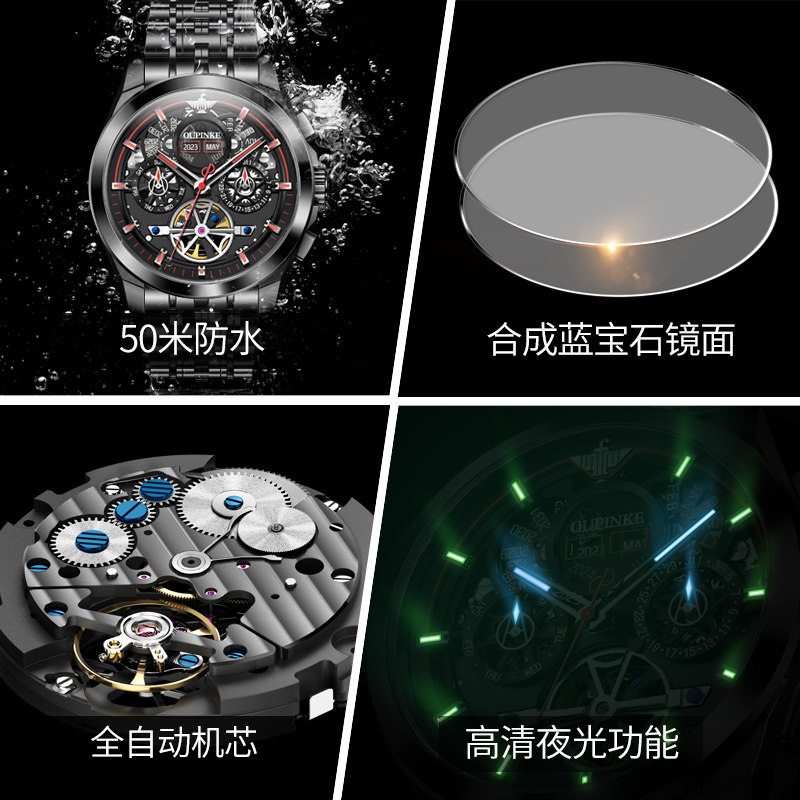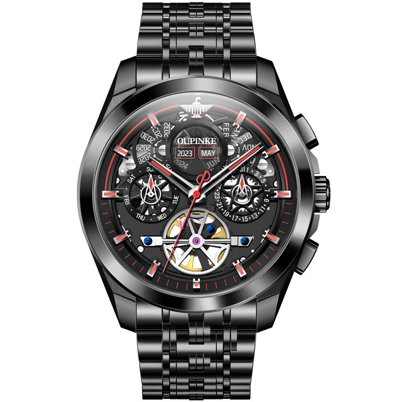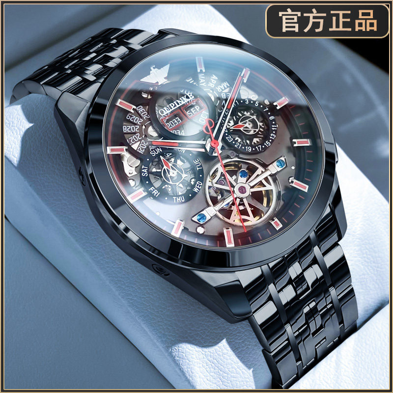 📚 瑞士认证正品牌多功能黑武士镂空机械表男士年月日陀飞轮防水十大