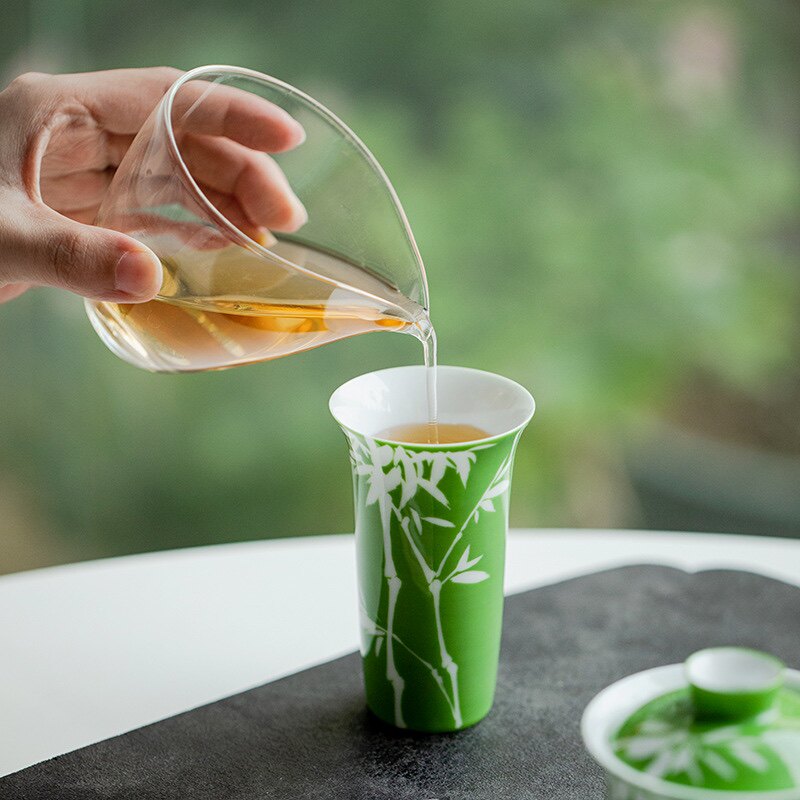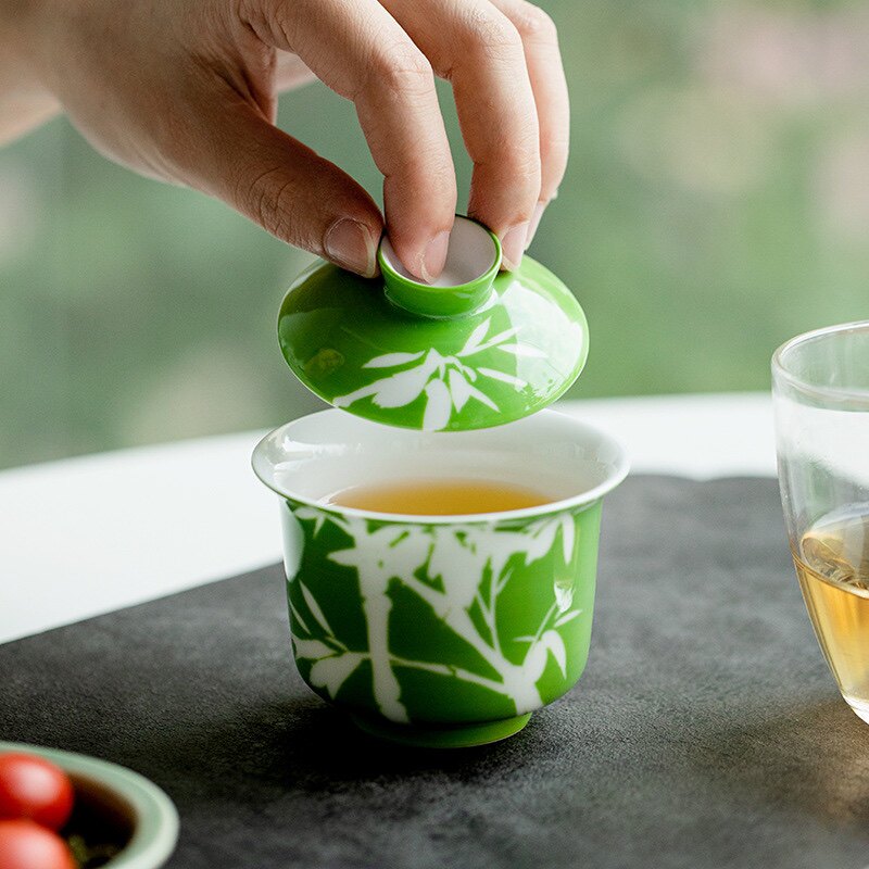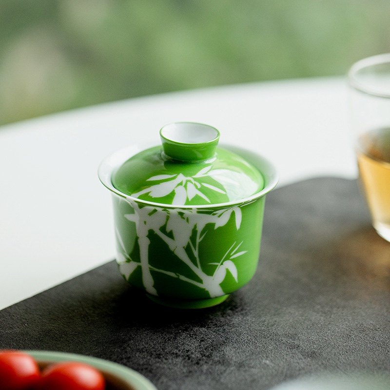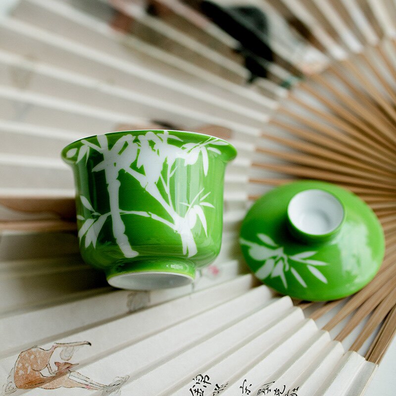 📚 雍正绿纯手绘翠竹盖碗茶杯家用陶瓷泡茶器功夫茶碗聚香杯单个茶杯