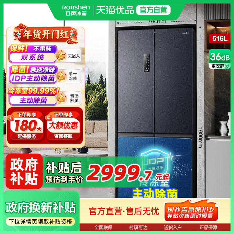 📚 容声516L双净双系统十字双开四门家用无霜嵌入电冰箱以旧换新补贴