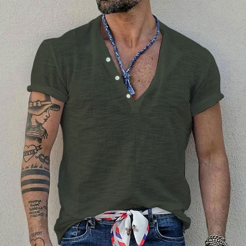 📚 2025欧美夏季男士竹节亨利系扣上衣纯色修身短袖T恤Men's T-Shirt