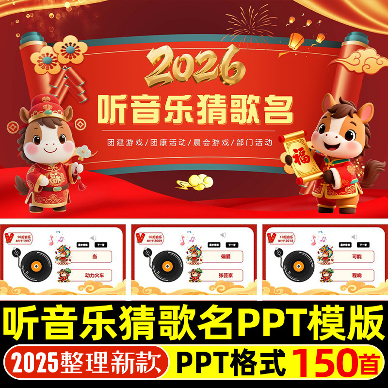 📚 听音乐猜歌名PPT模版2026马年会学校年会团建活动互动小游戏PPT