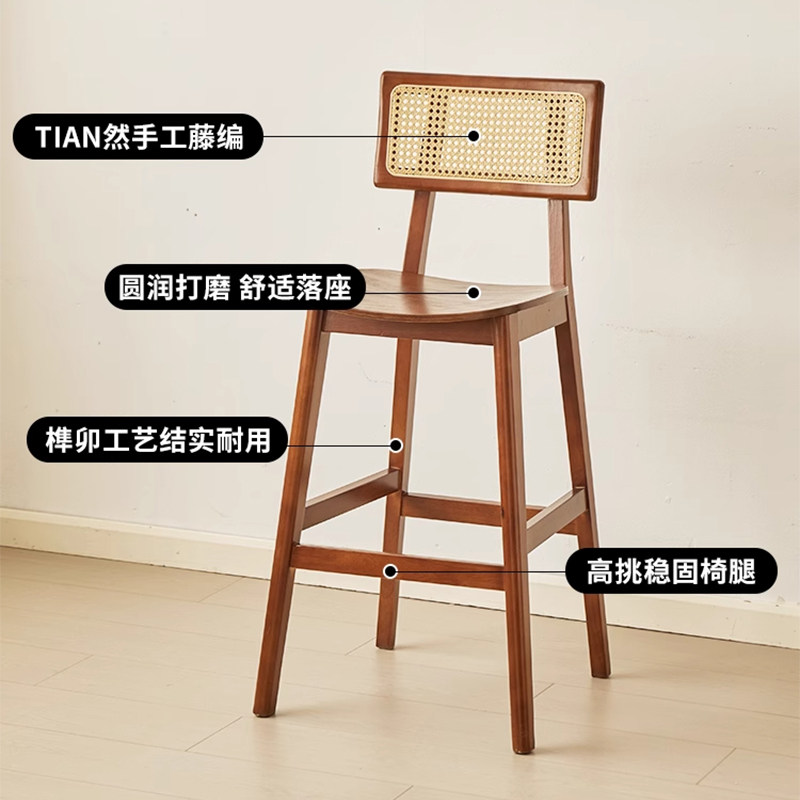📚 球球复古藤编实木吧台椅岛台椅子高脚凳家用咖啡餐厅靠背中古休闲