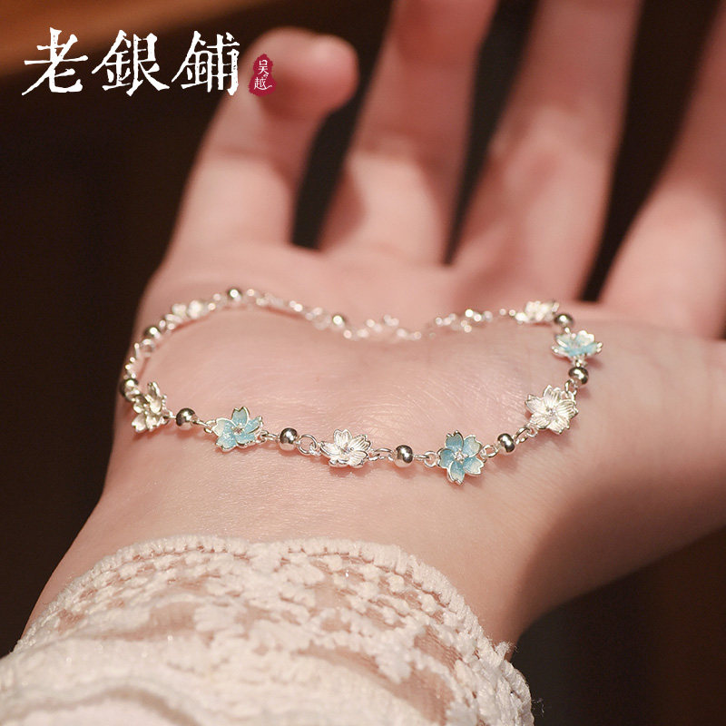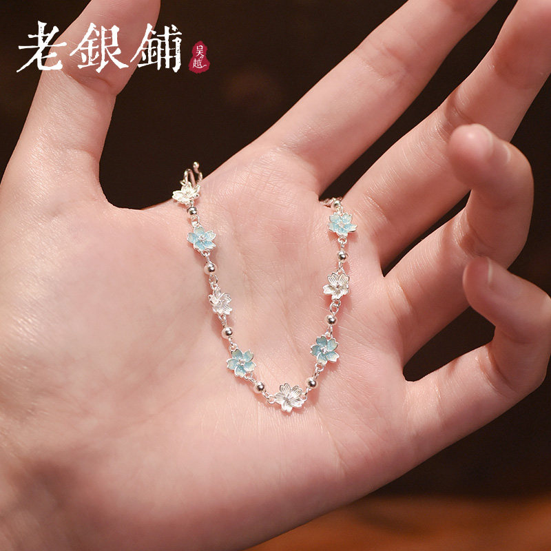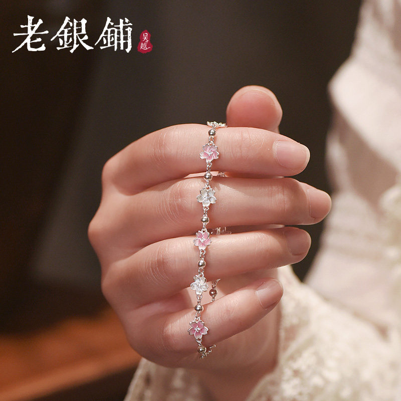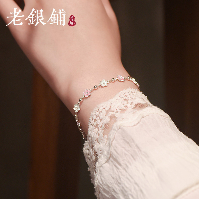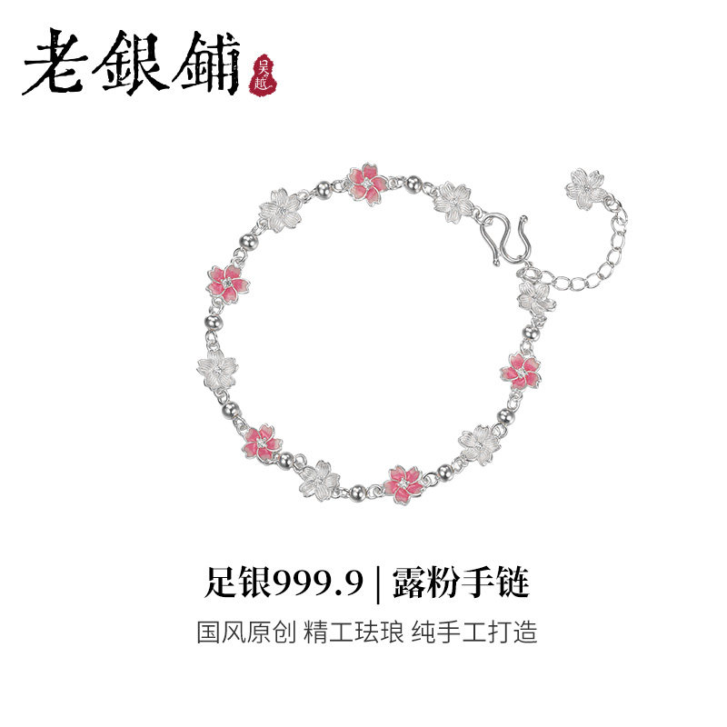 📚 吴越老银铺纯银9999露粉手链银饰樱花珐琅手串少女心闺蜜礼物手饰