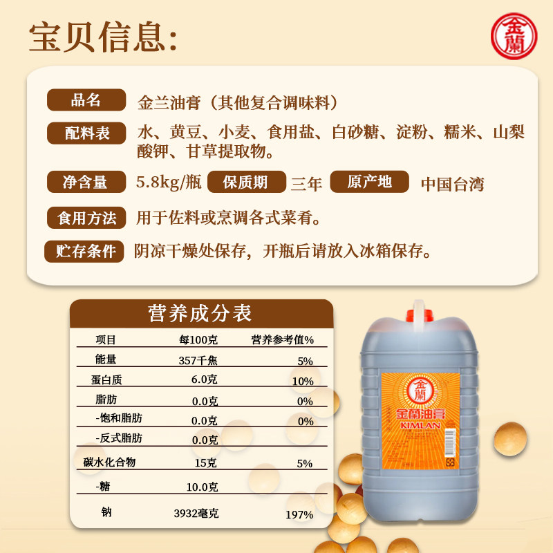📚 台湾进口包邮桶装原装酿造金兰油膏5L调味酱上色台式卤肉饭三杯鸡