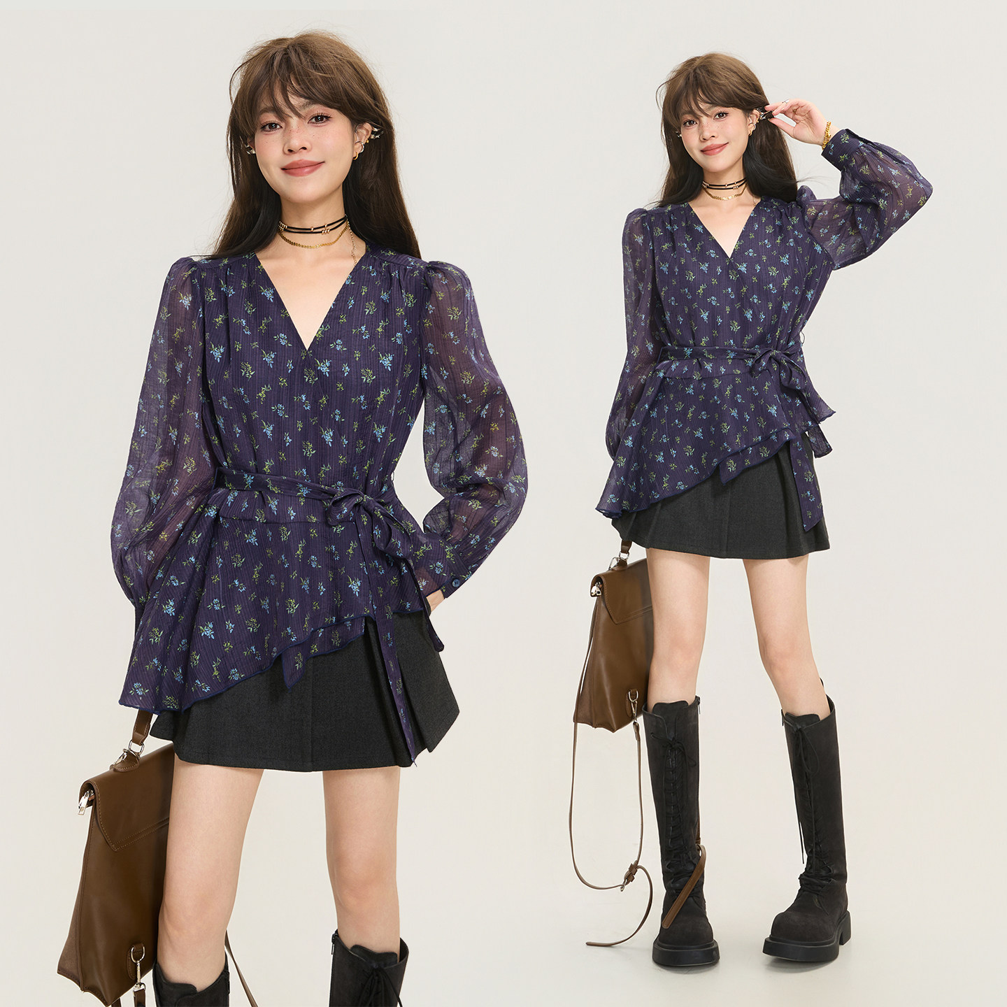 📚 KEIKO 法式复古碎花V领衬衫秋季洋气高贵感不规则系带显瘦小上衣