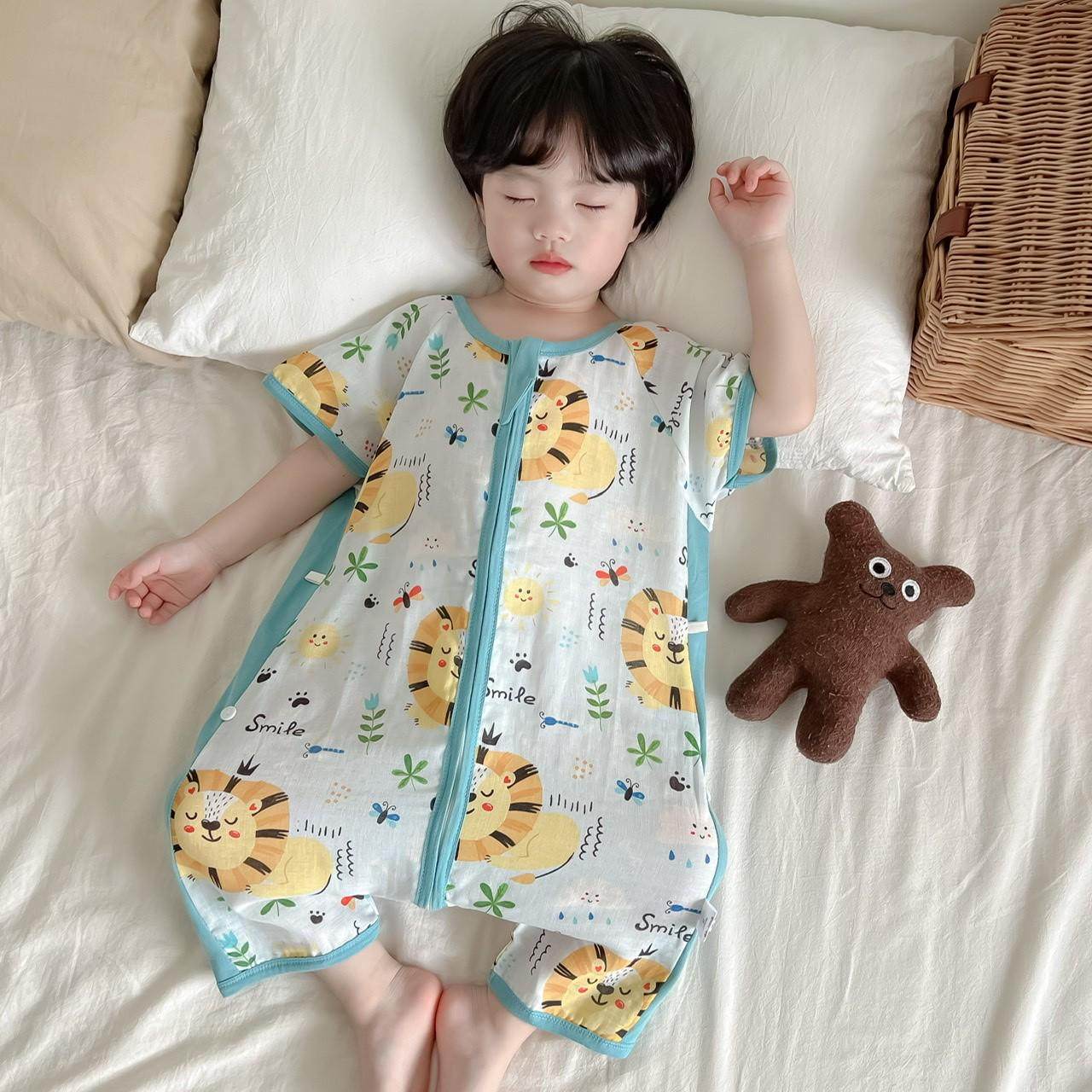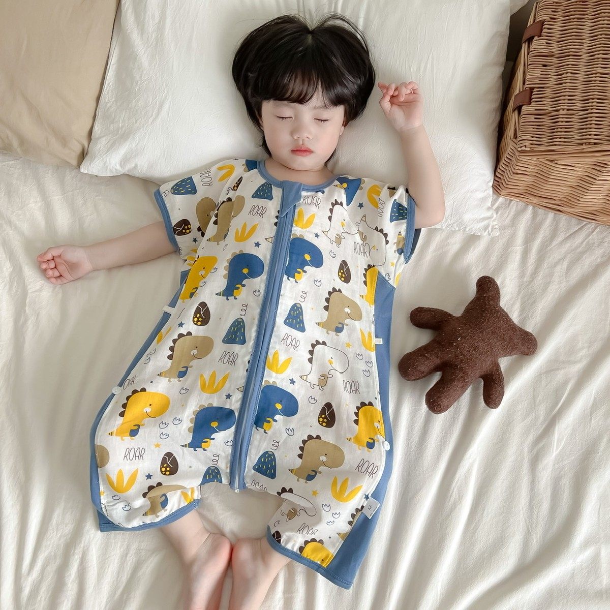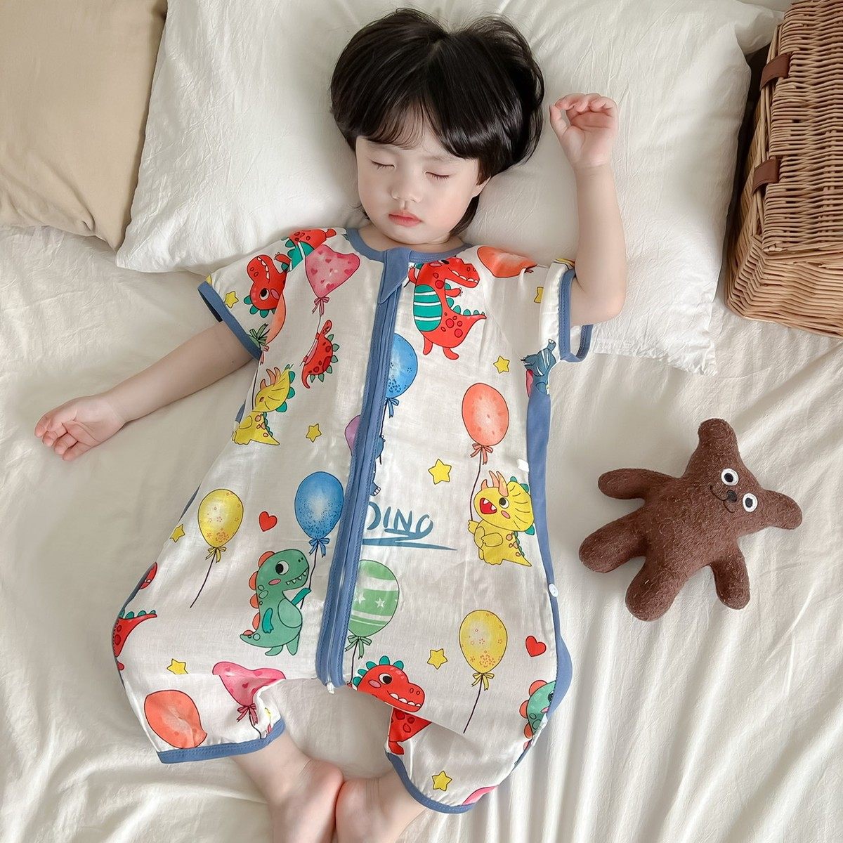 📚 儿童挖掘机睡袋夏季纯棉薄款男童小汽车连体睡衣恐龙防踢被女宝宝