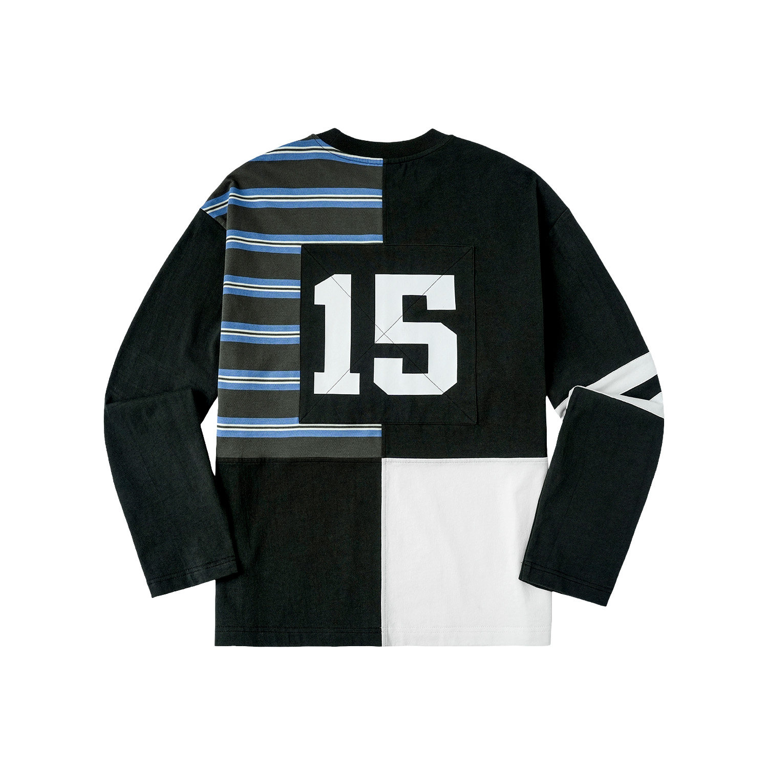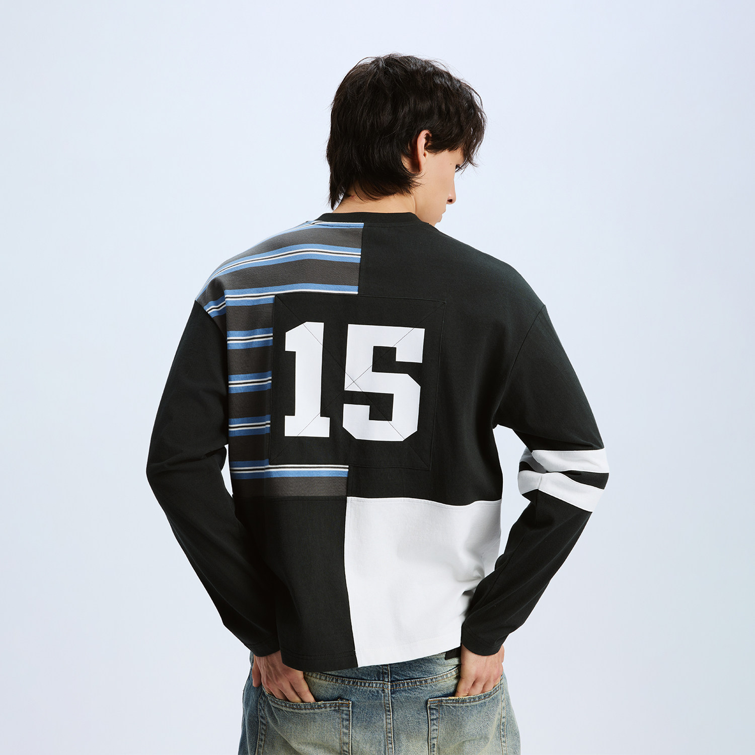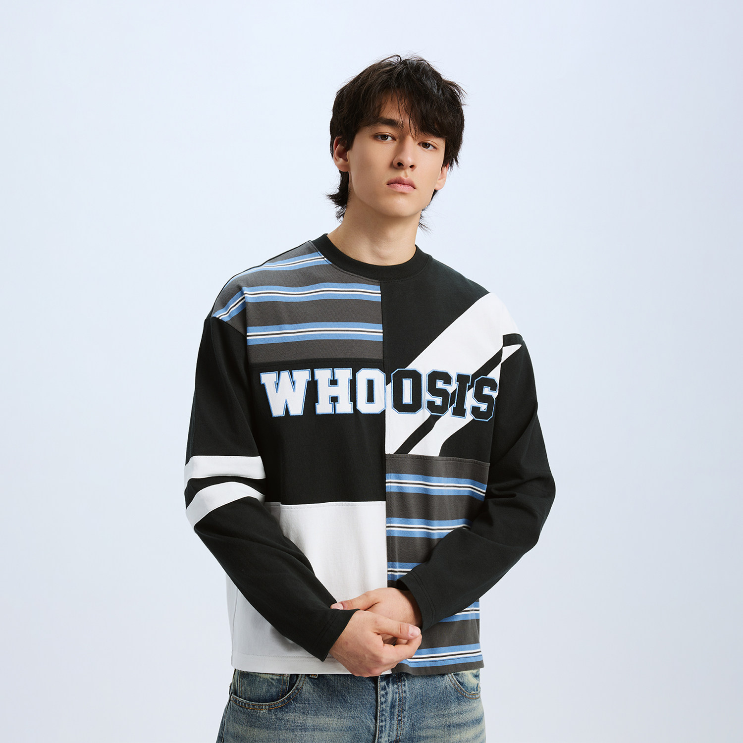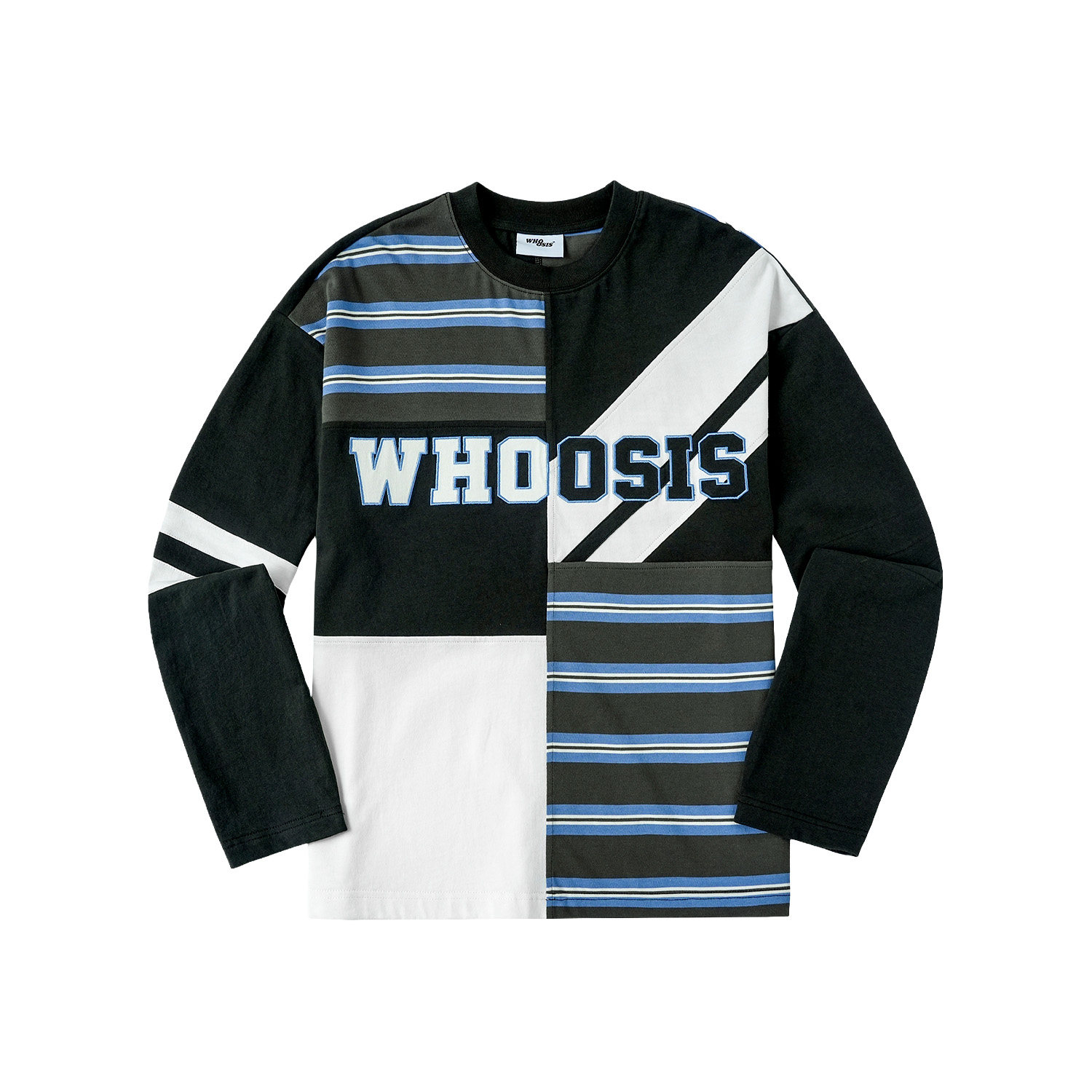 📚 WHOOSIS(不知其名)条纹拼接印花刺绣长袖T恤春季新品校园男女潮