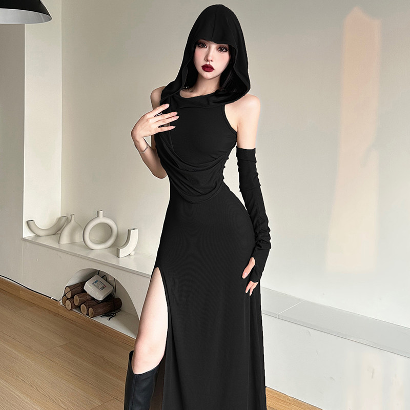 📚 #Sisjuly#沙丘废土风不规则垂感连帽连衣裙女 超显身材高开衩长裙