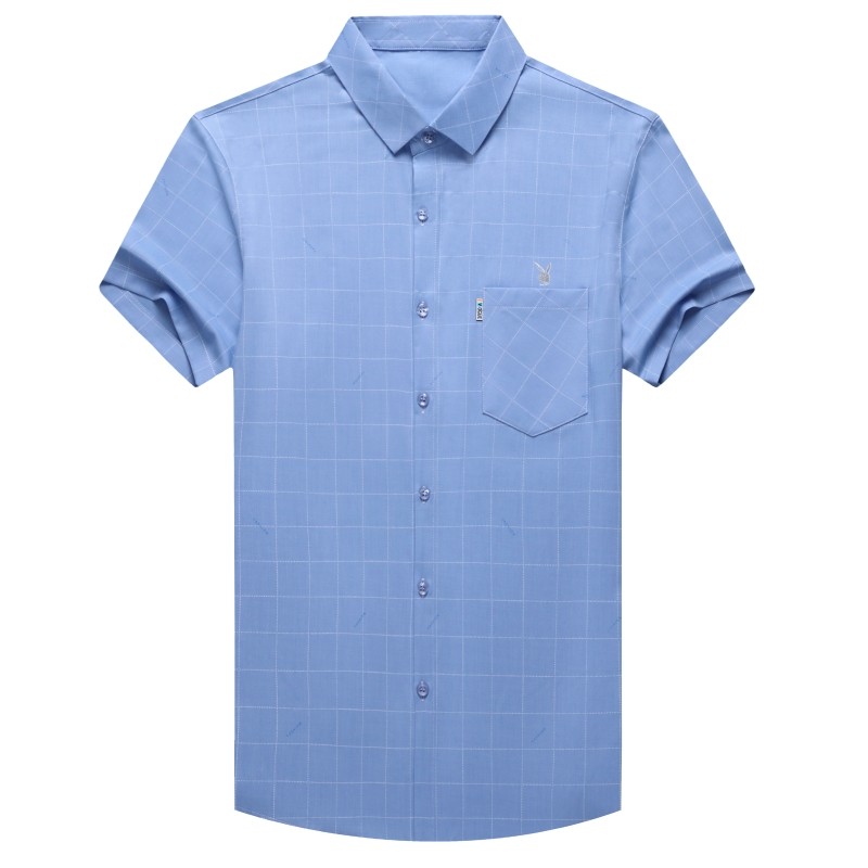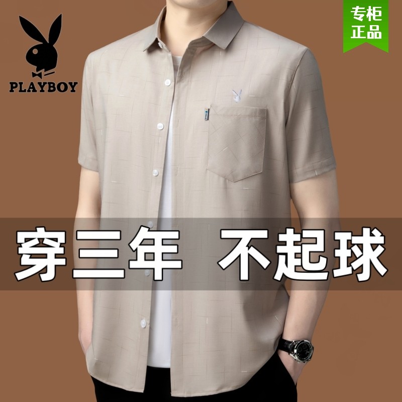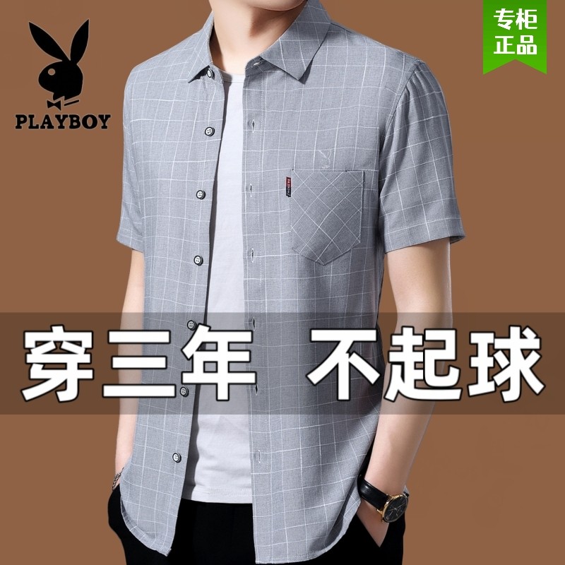 📚 花花公子纯棉短袖衬衫男款中年爸爸夏装半袖高级免烫宽松格子衬衣