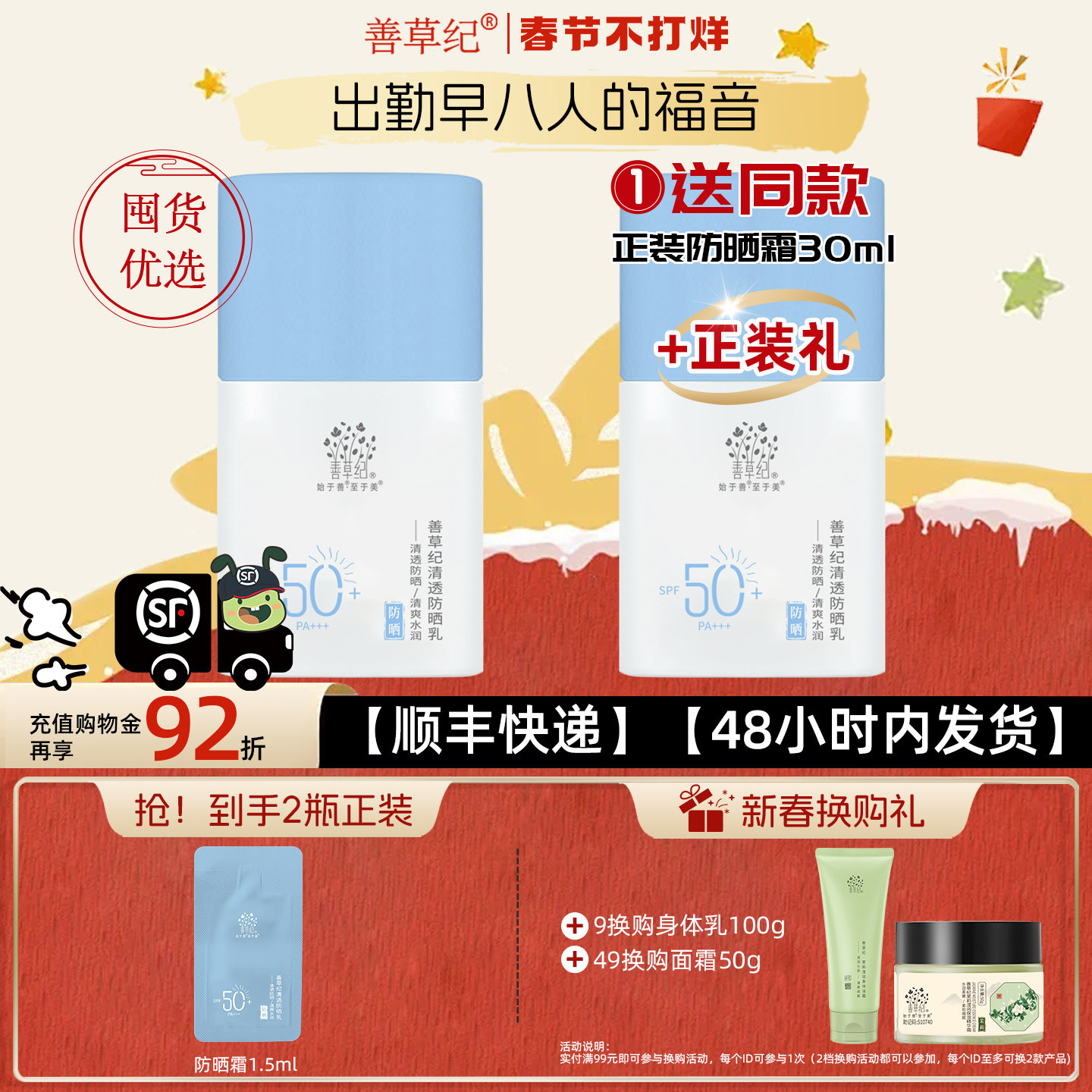 📚 善草纪清透防晒乳防水防汗补水保湿隔离防晒霜户外出游SPE50+