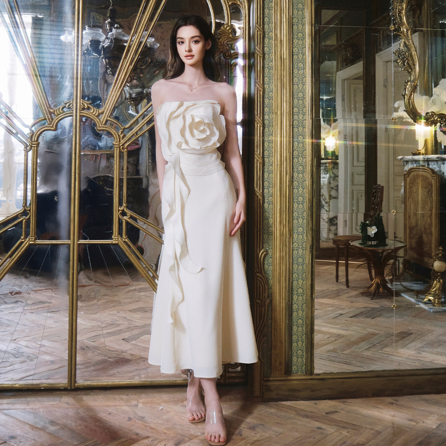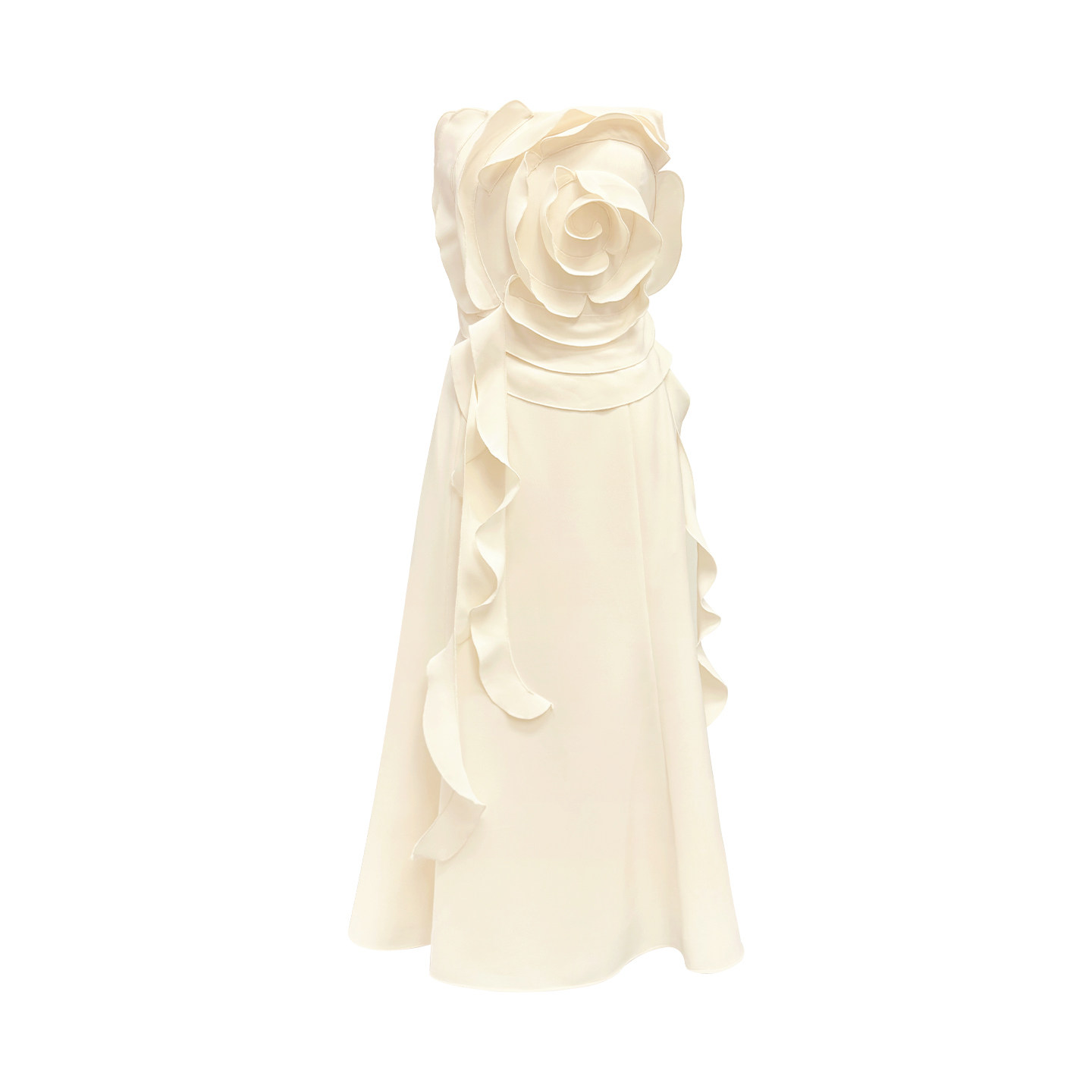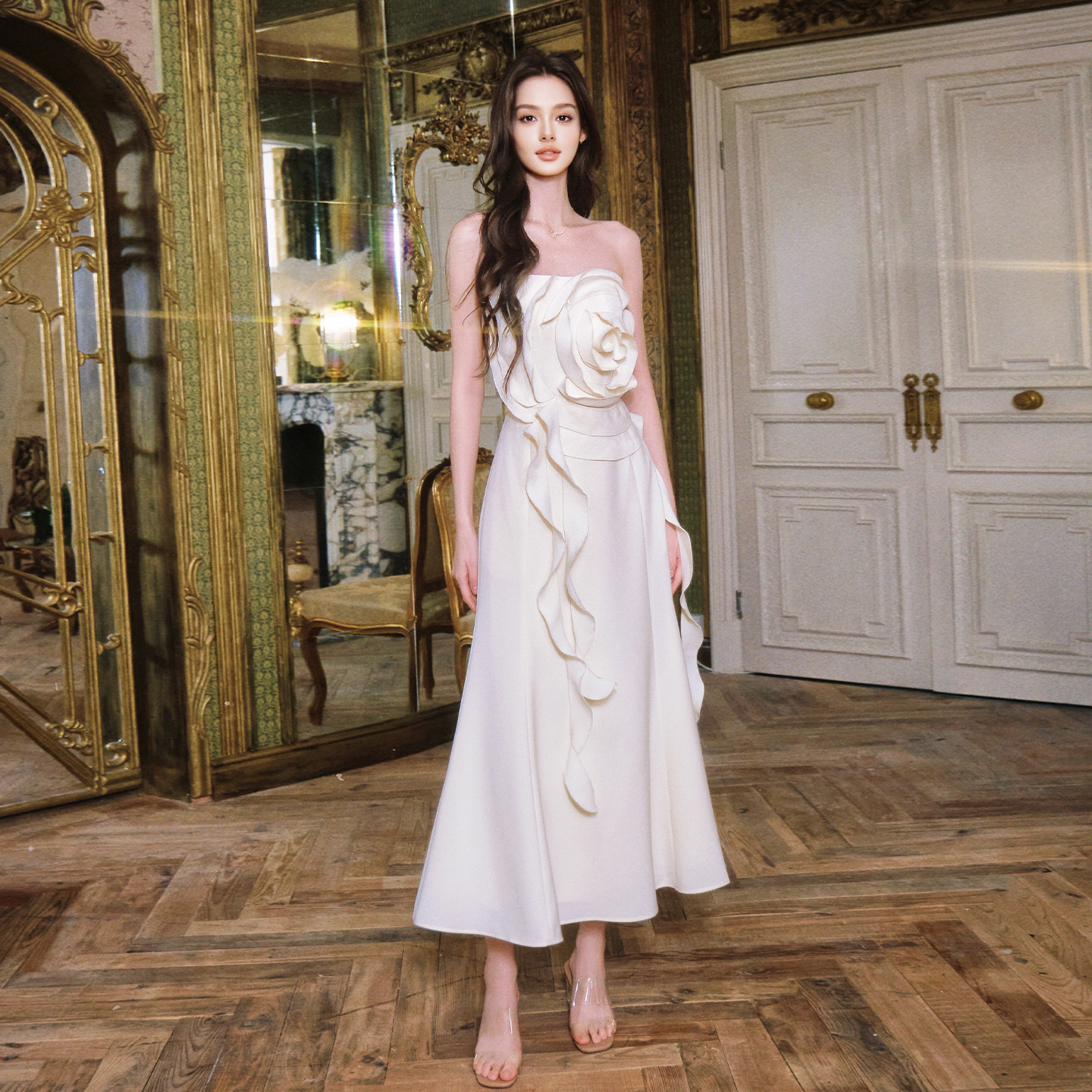 📚 FLONAKED香槟色荷叶边立体花朵显瘦抹胸连衣裙婚礼纪念日生日礼服
