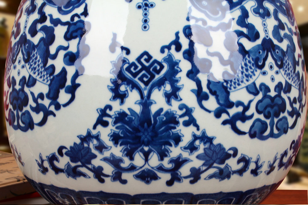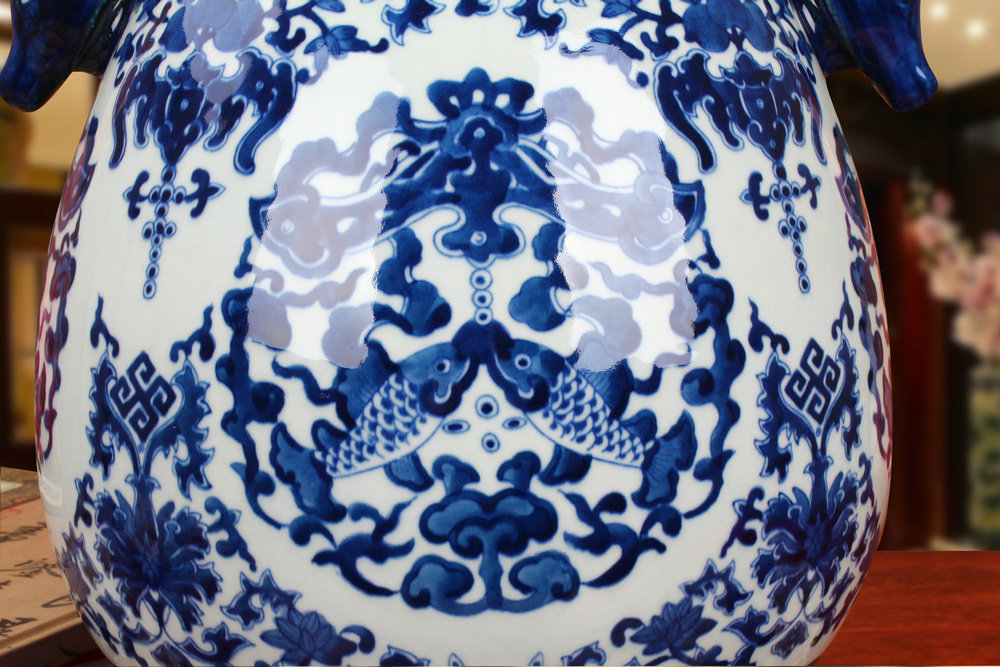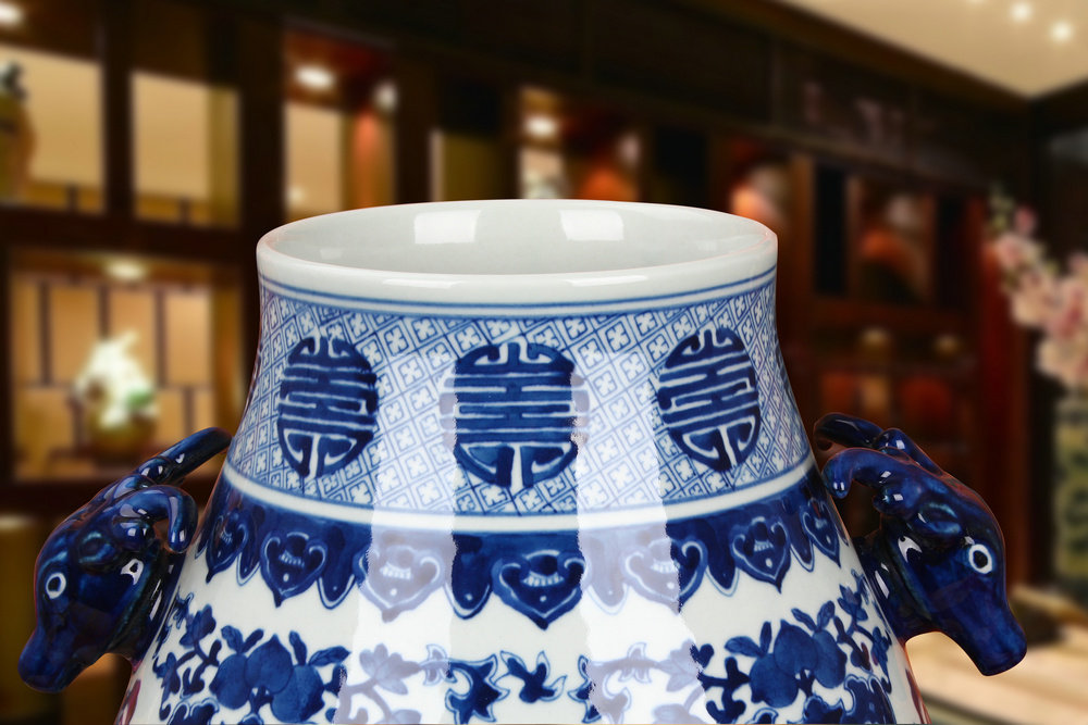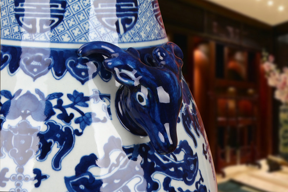 📚 景德镇陶瓷器 仿古手绘青花瓷八宝纹双鹿头尊福筒花瓶 古典摆件设