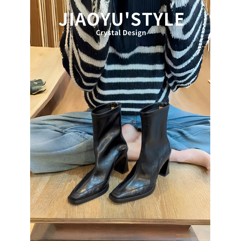 📚 真皮~骄屿短靴女2025秋冬新款高跟靴子方头小踝靴粗跟法式瘦瘦靴