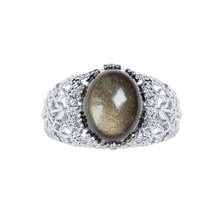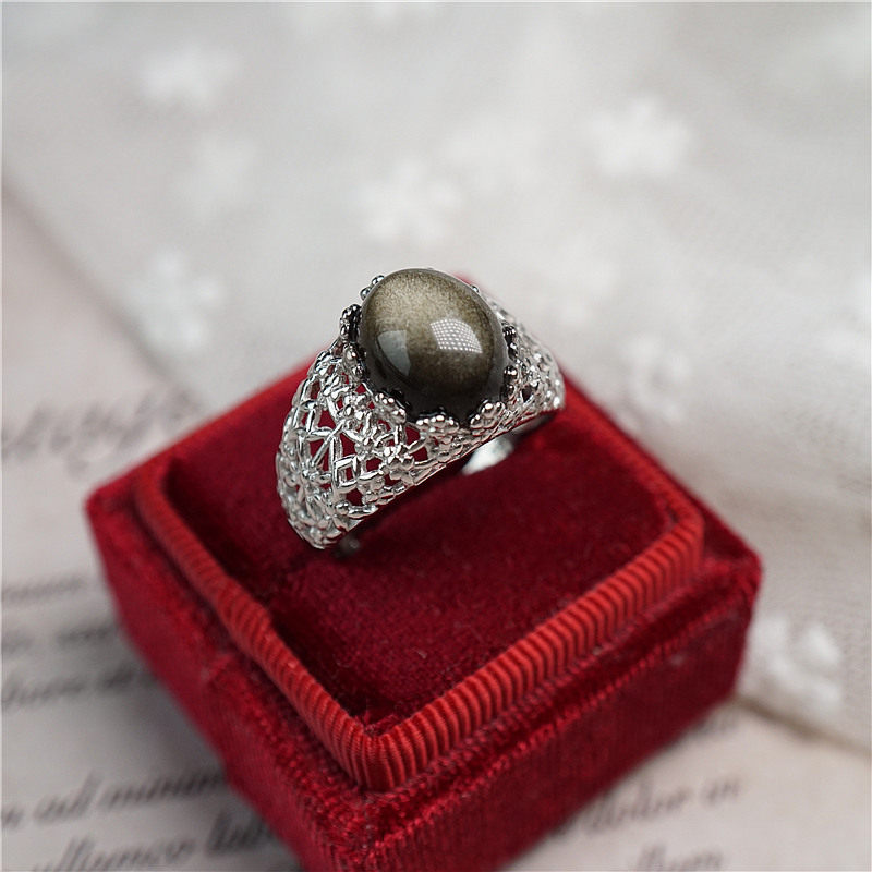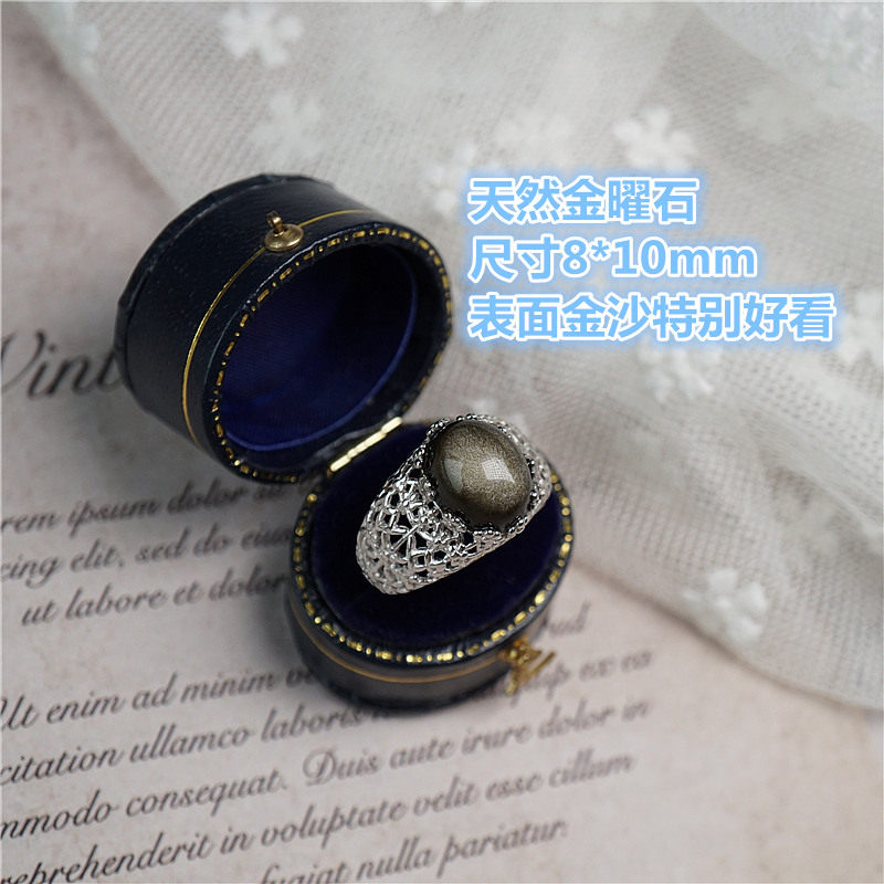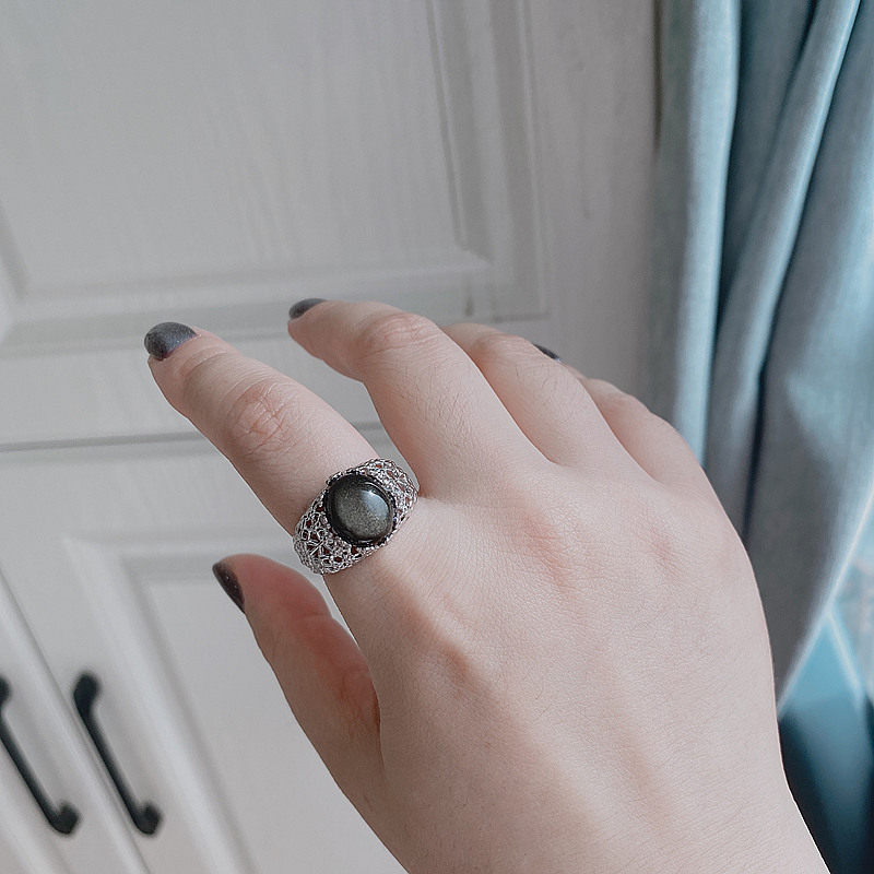 📚 天然黑曜石金曜石蕾丝戒指大码食指纯银指环气质夸张可调节新年礼