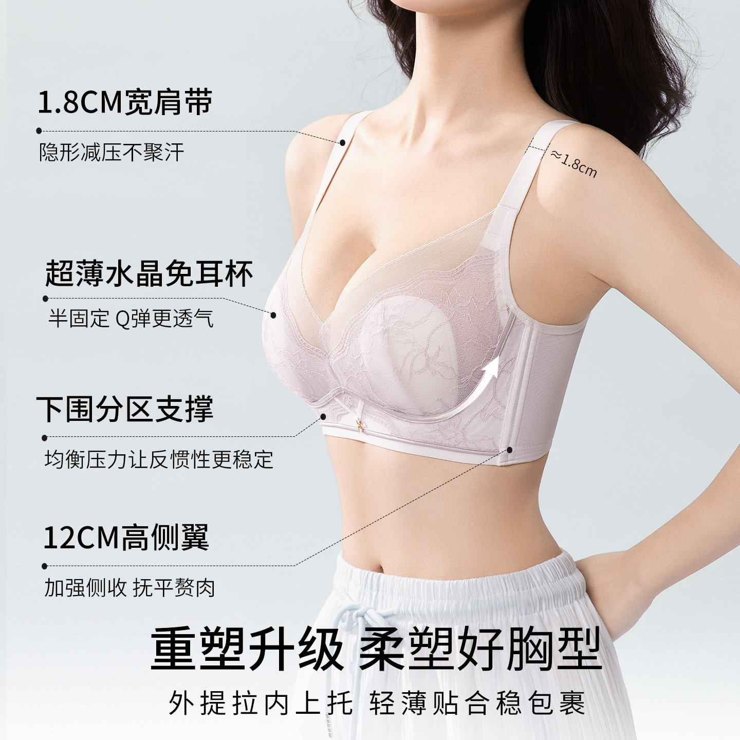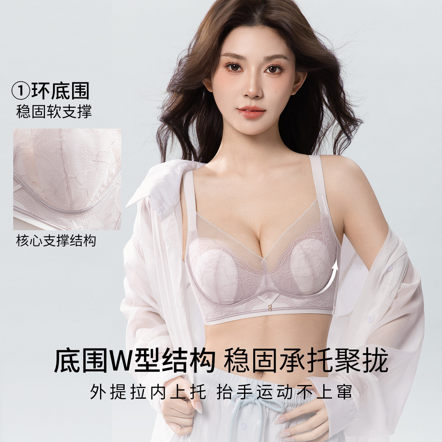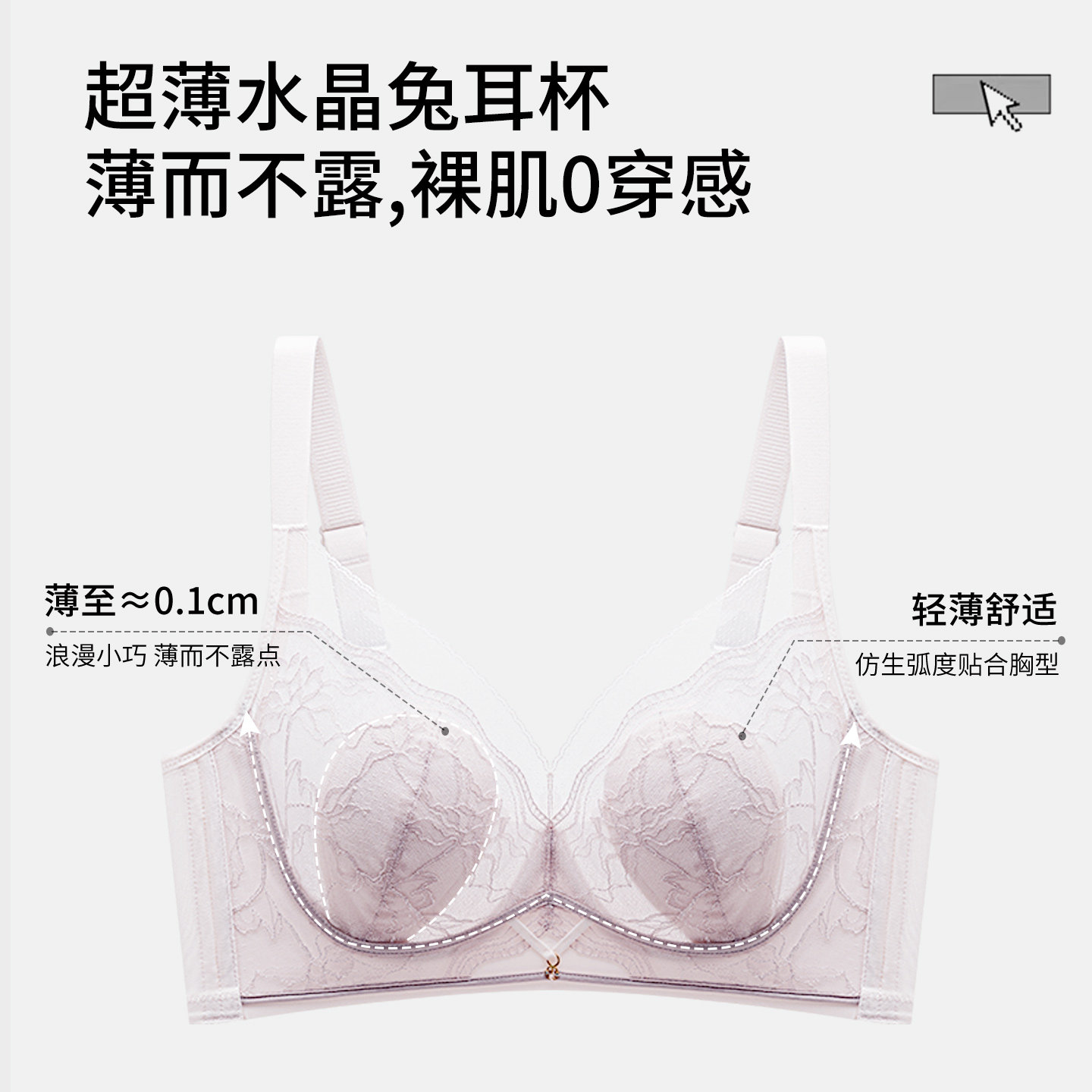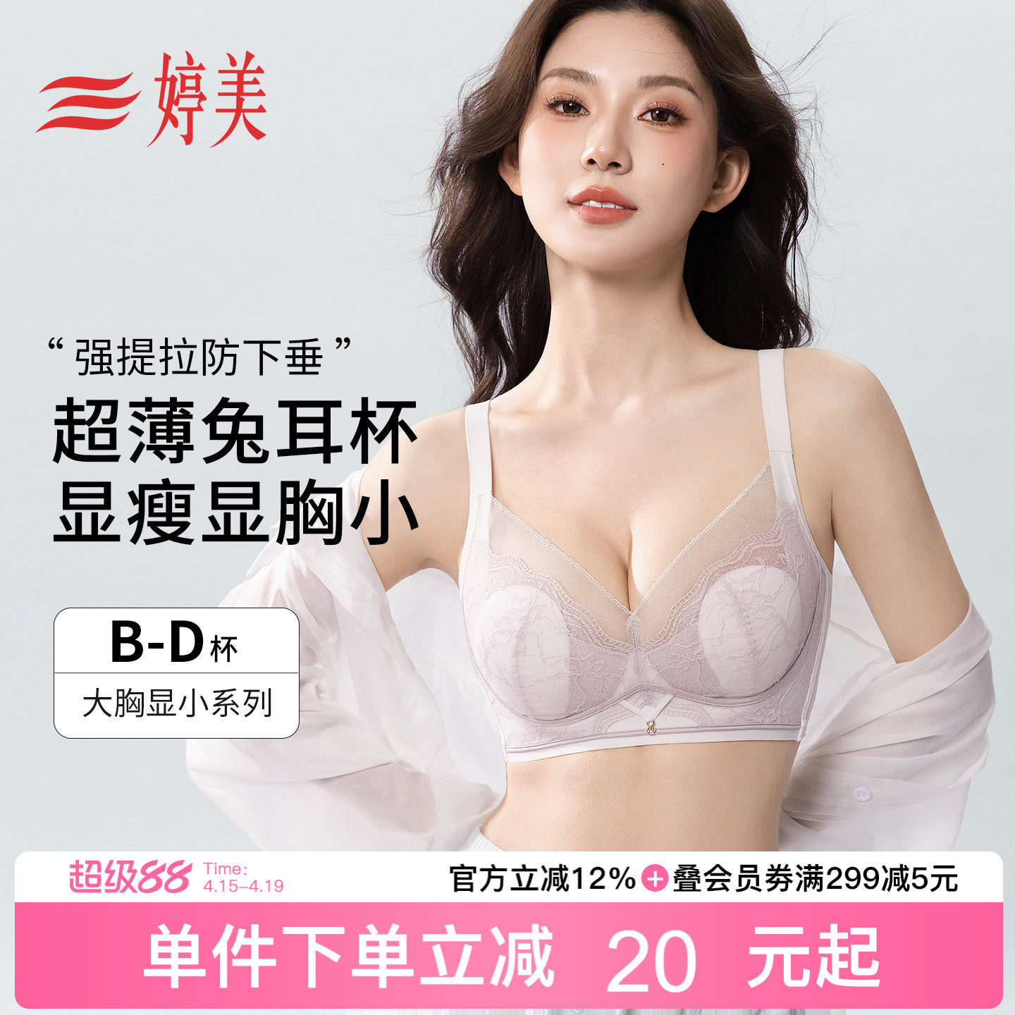 📚 婷美2026夏薄款大胸显小文胸兔耳杯提拉防垂调整型收副乳蕾丝内衣