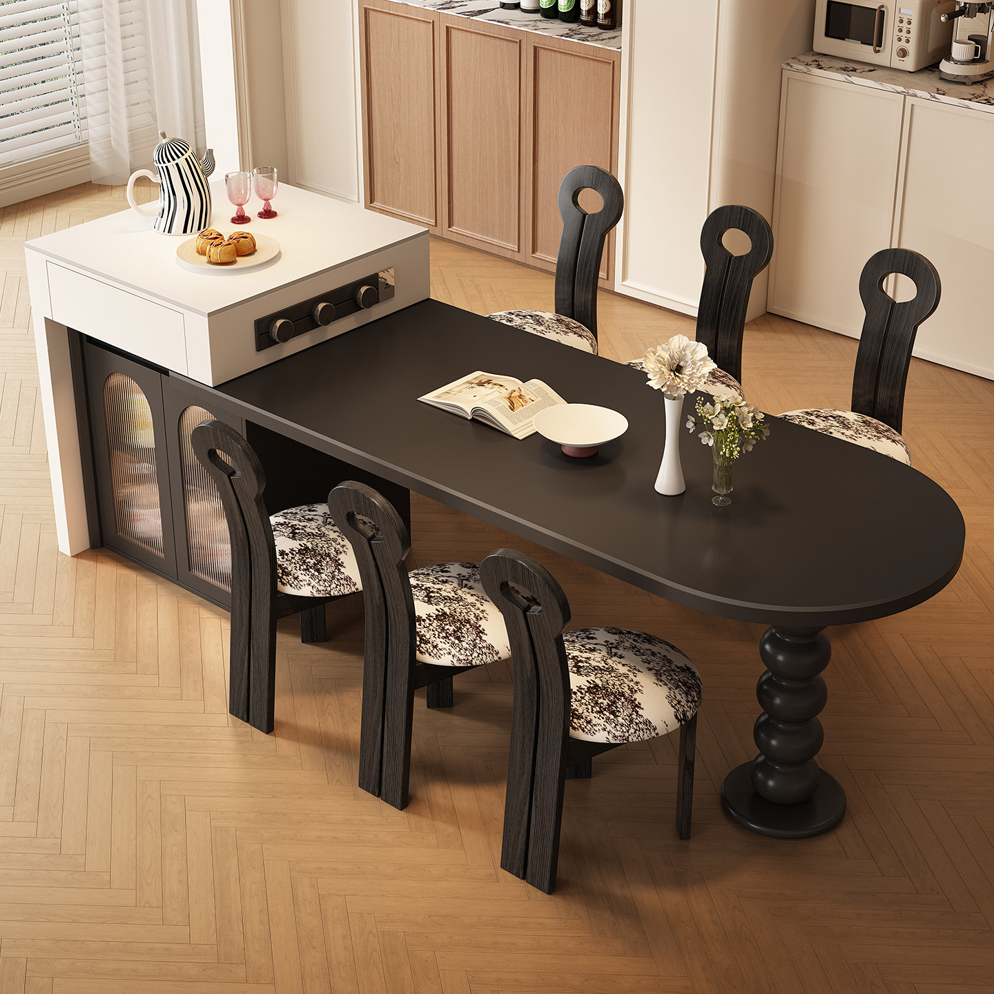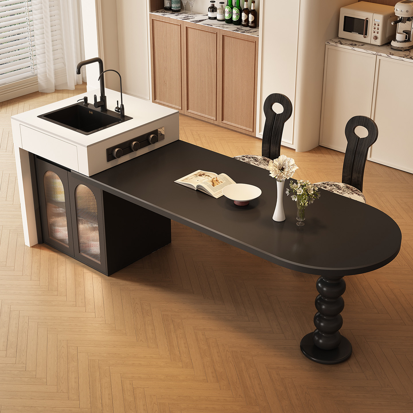 📚 中古风复古岛台餐桌一体家用可伸缩半圆弧形岩板开放厨房中导吧台