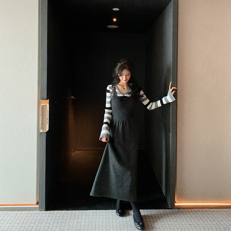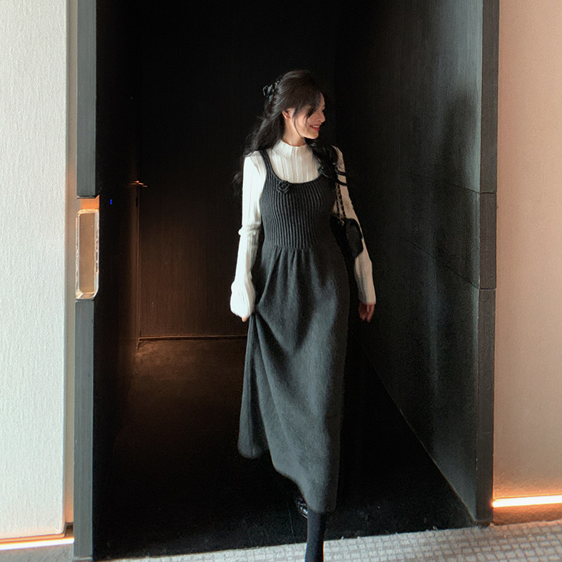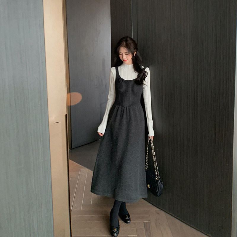 📚 bigyu 千金风叠穿吊带裙子春秋外穿打底高腰长款花朵针织连衣裙