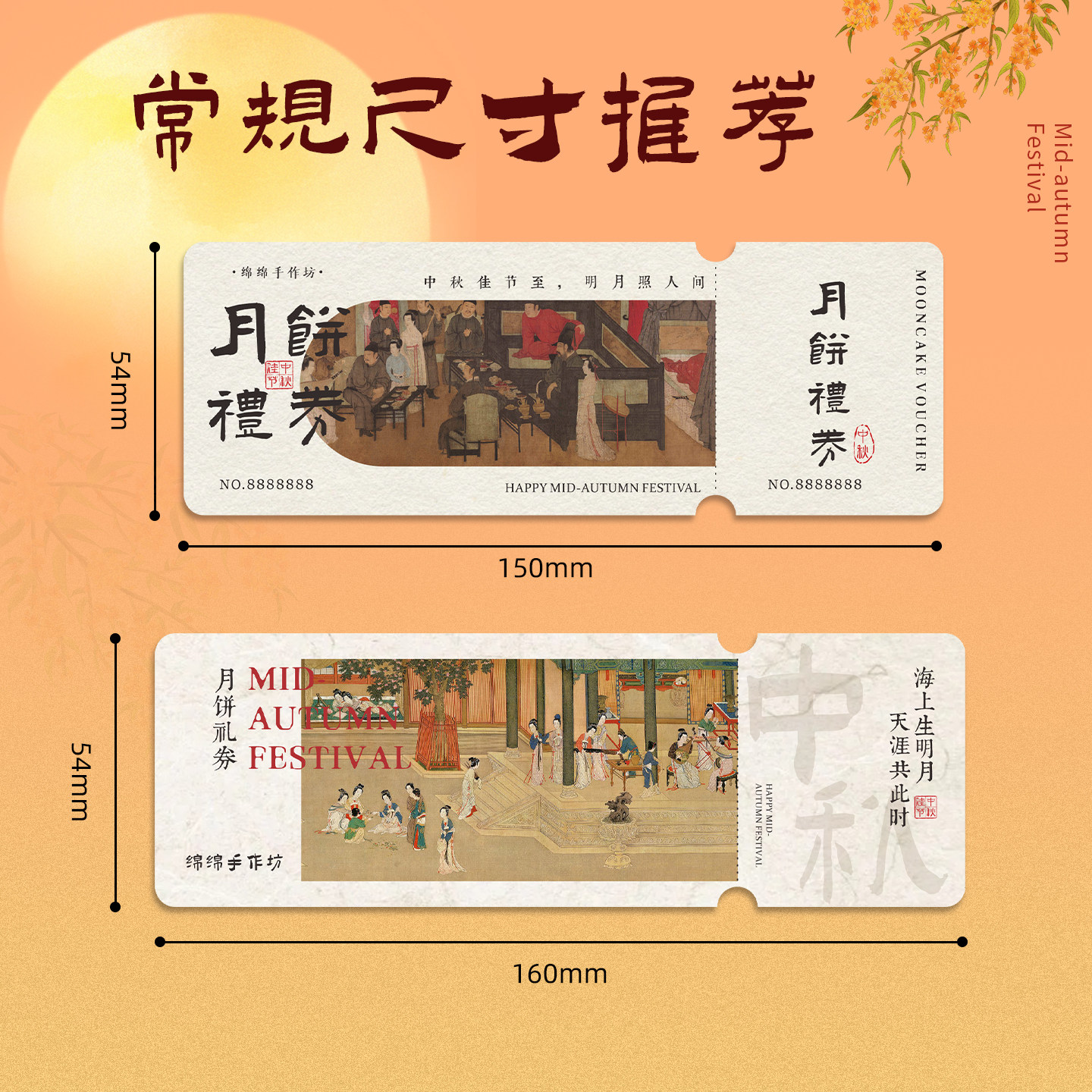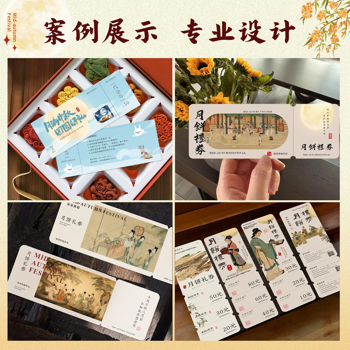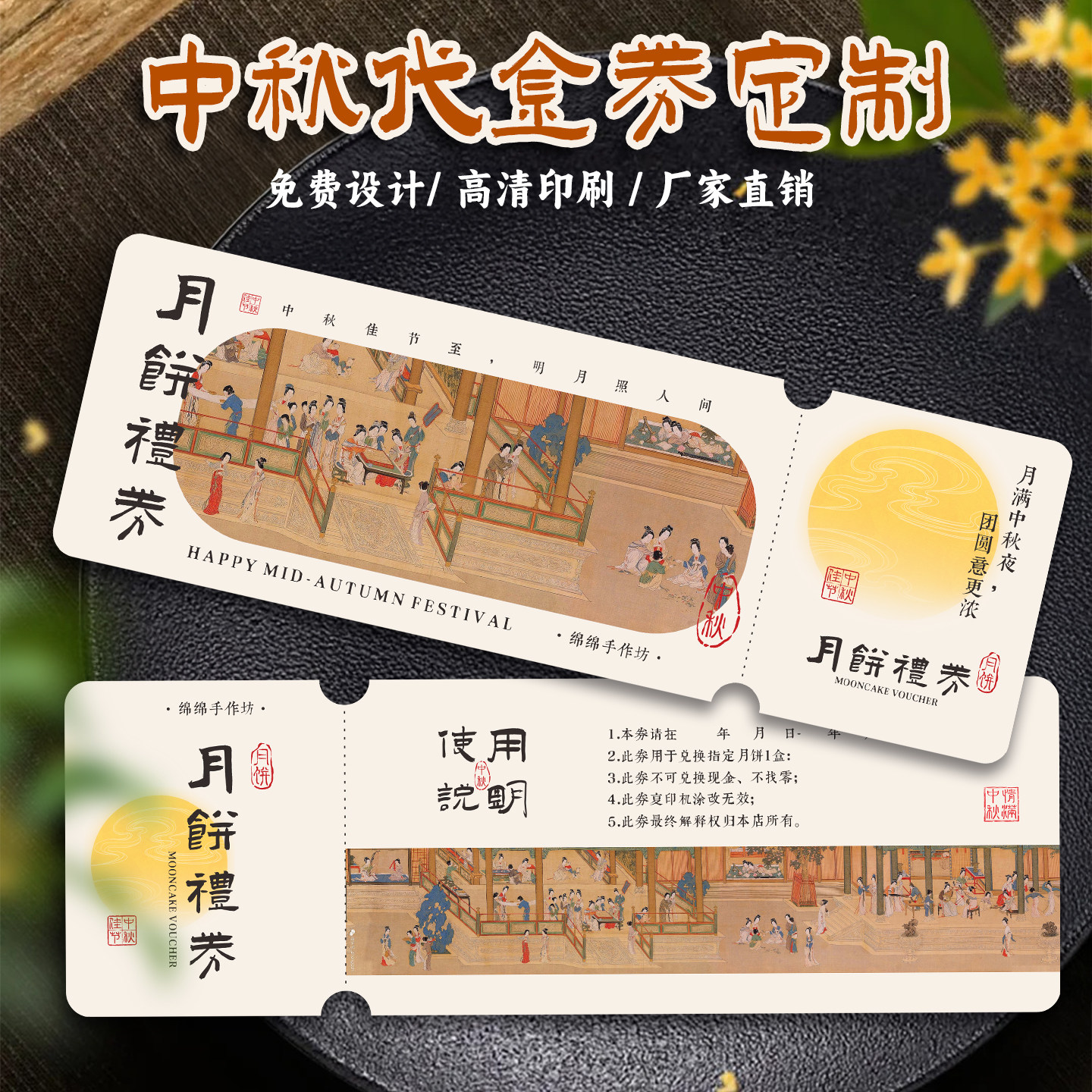 📚 中秋节代金券定制新中式国风月饼礼券提货兑换券现金抵扣券企业送礼品卡博饼活动抽奖券可撕多联正副券印刷