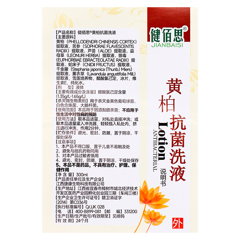 📚 健佰思黄柏抗菌洗液淡黄盒300ml植物草本女性私处护理黄柏抗菌液